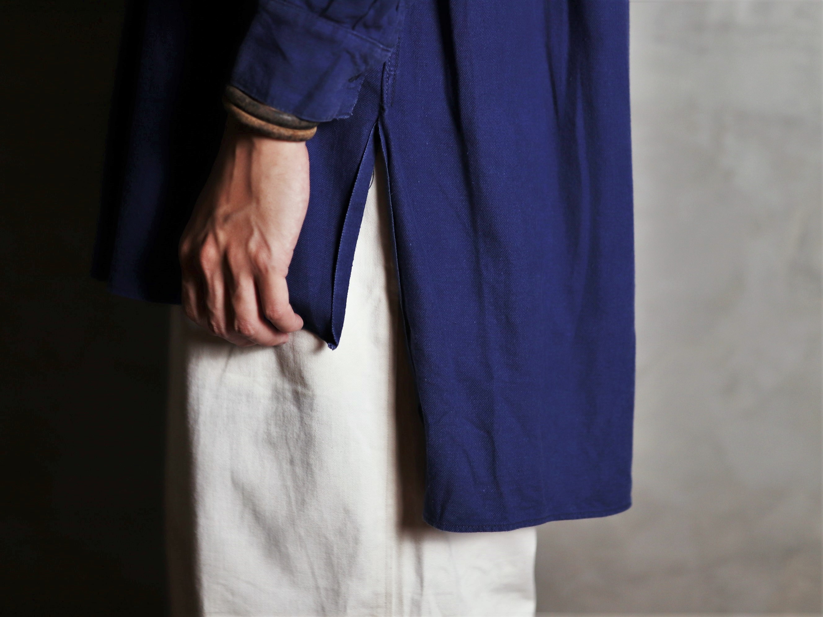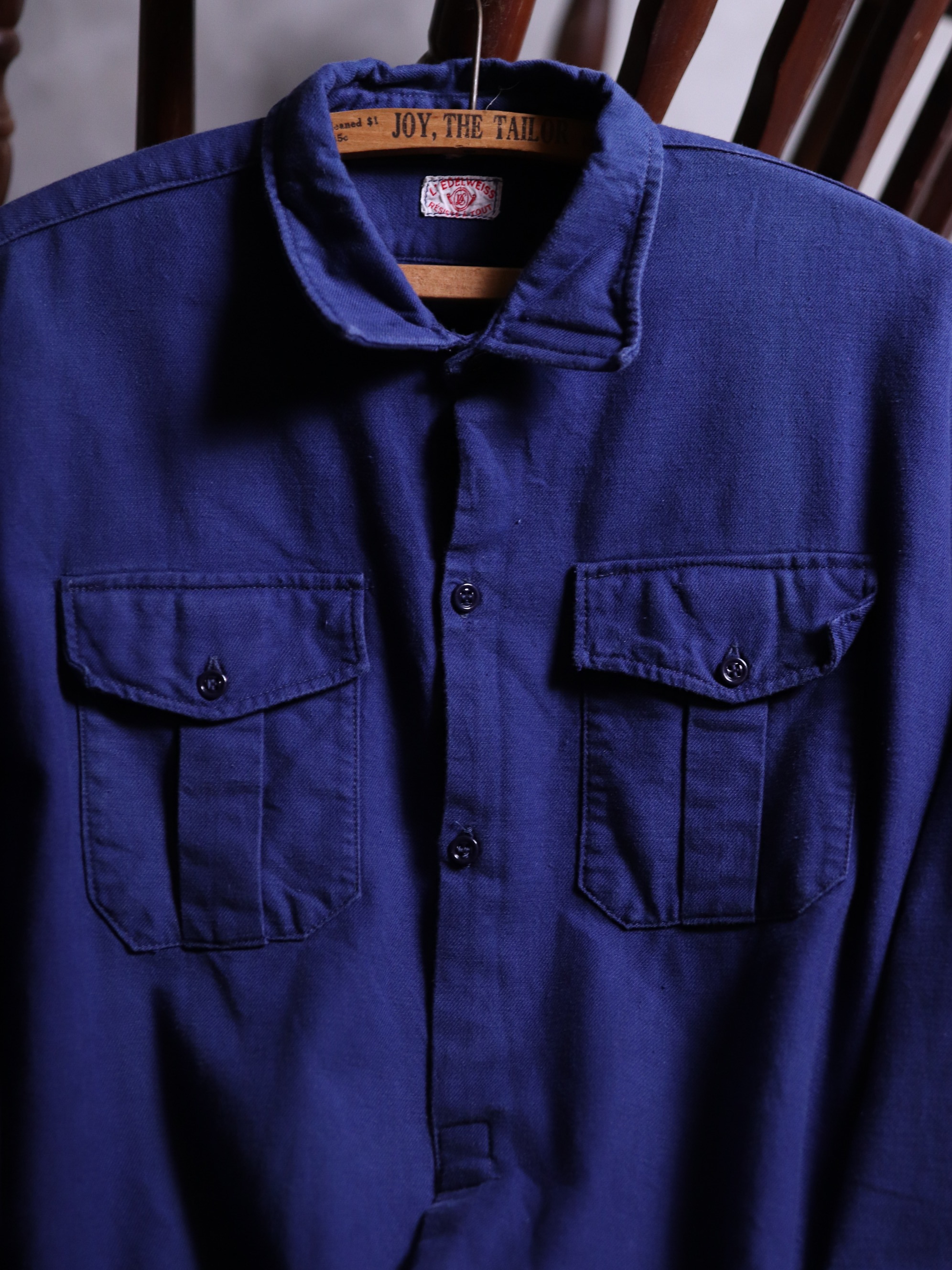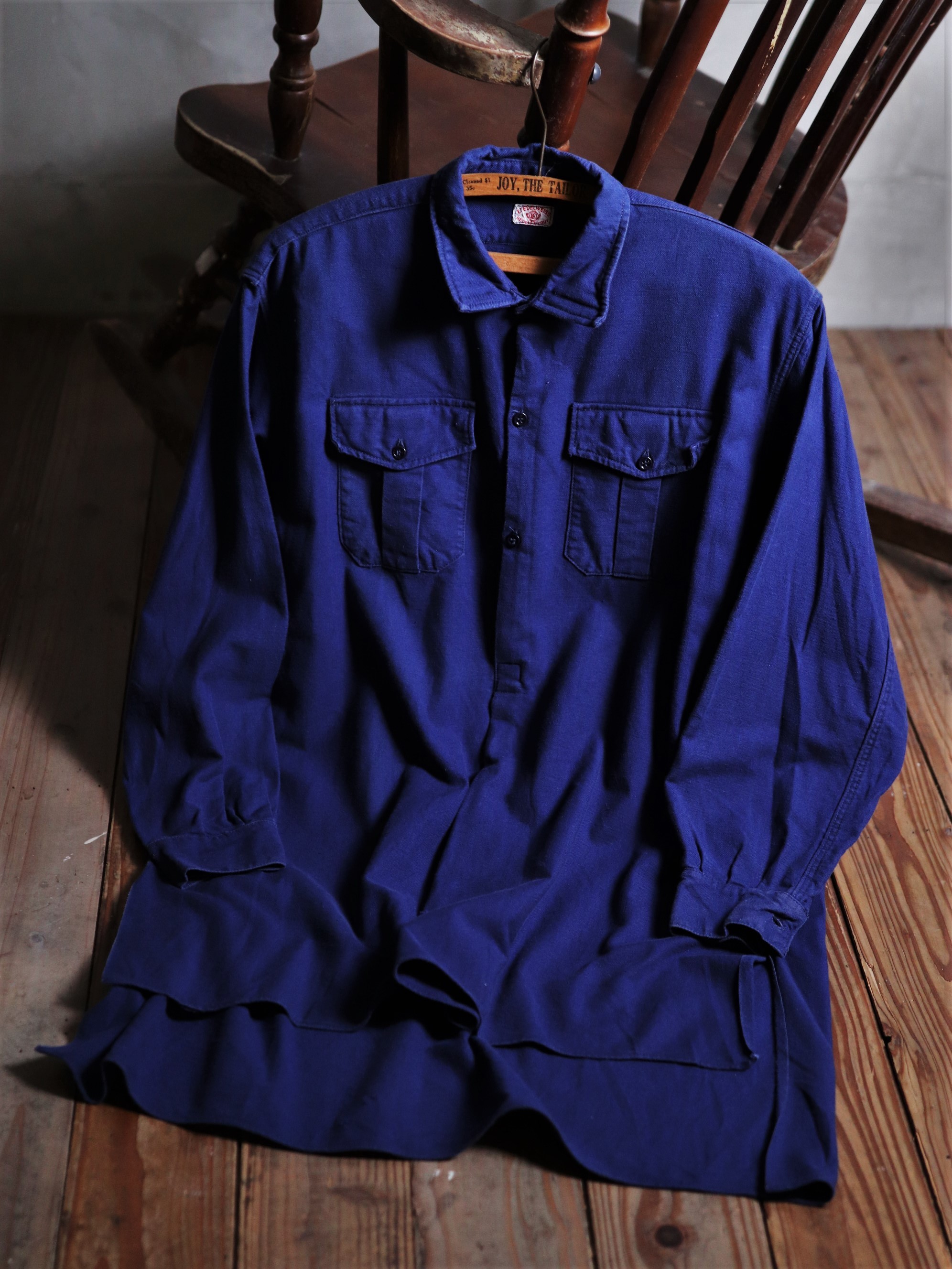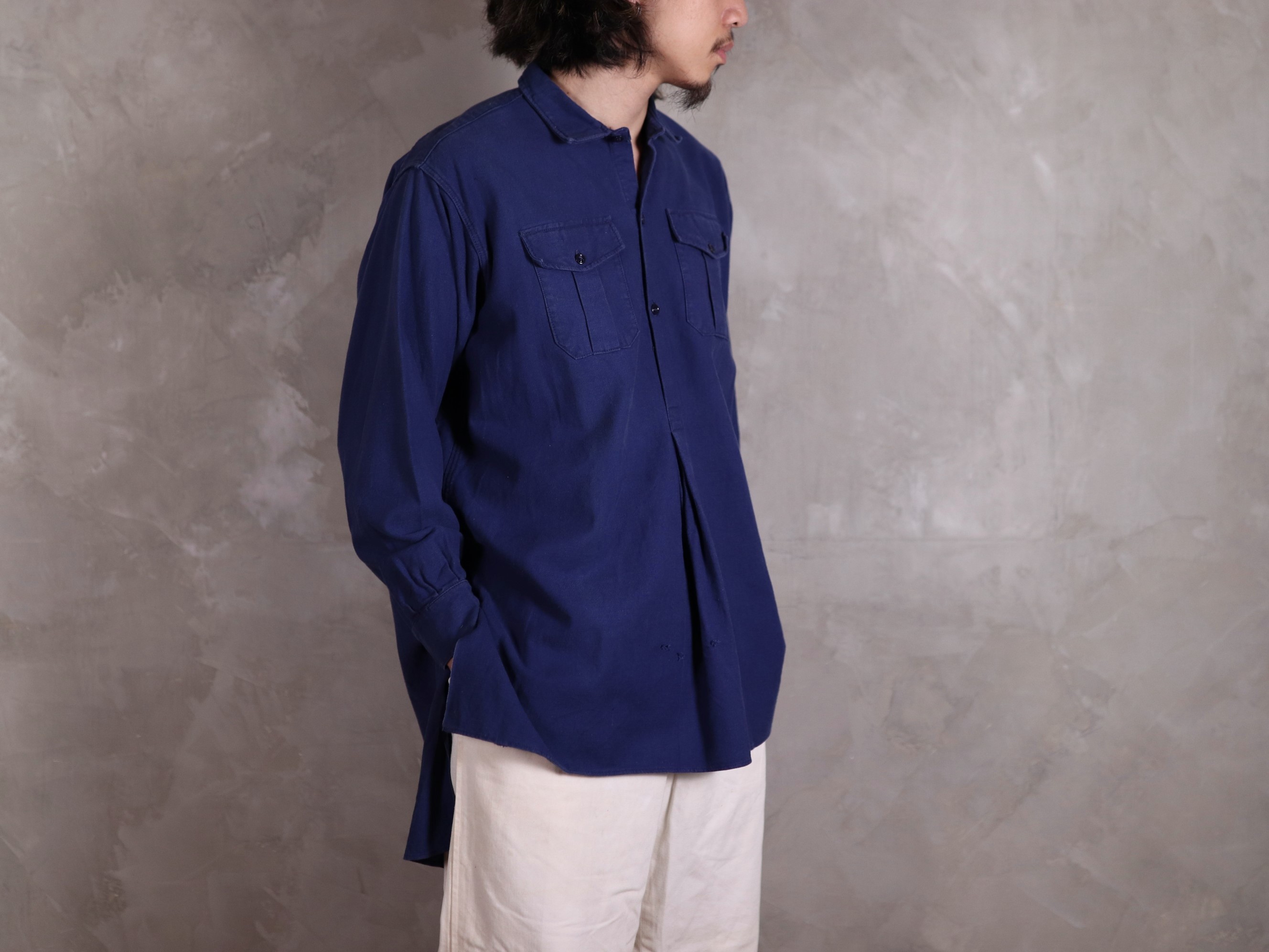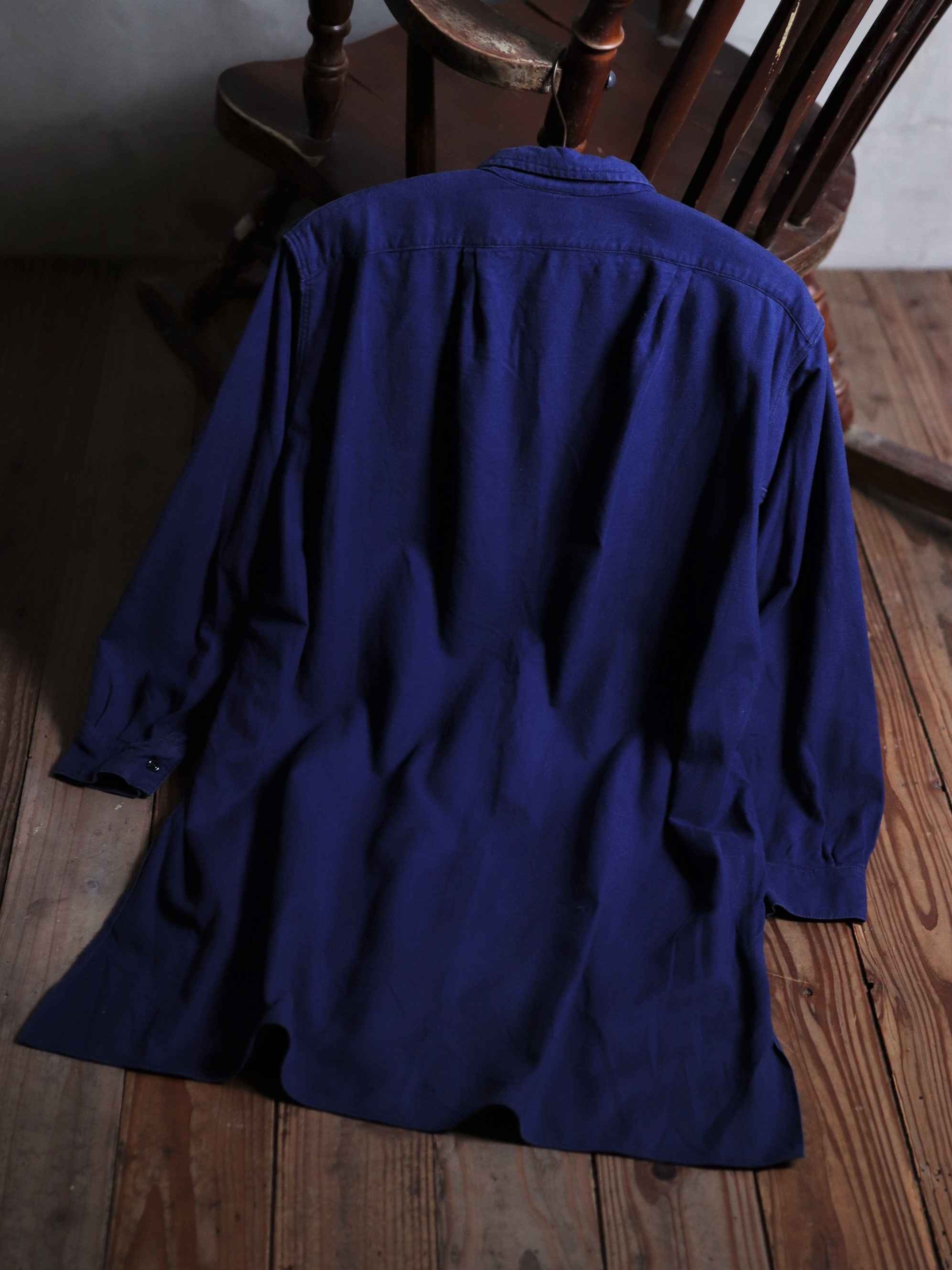1940年代/法國早期長版藍染襯衫/Indigo藍染/胸前兩側立體口袋/前短後長/兩側開岔/袖口及背後打摺/斜紋面料/內刷絨
