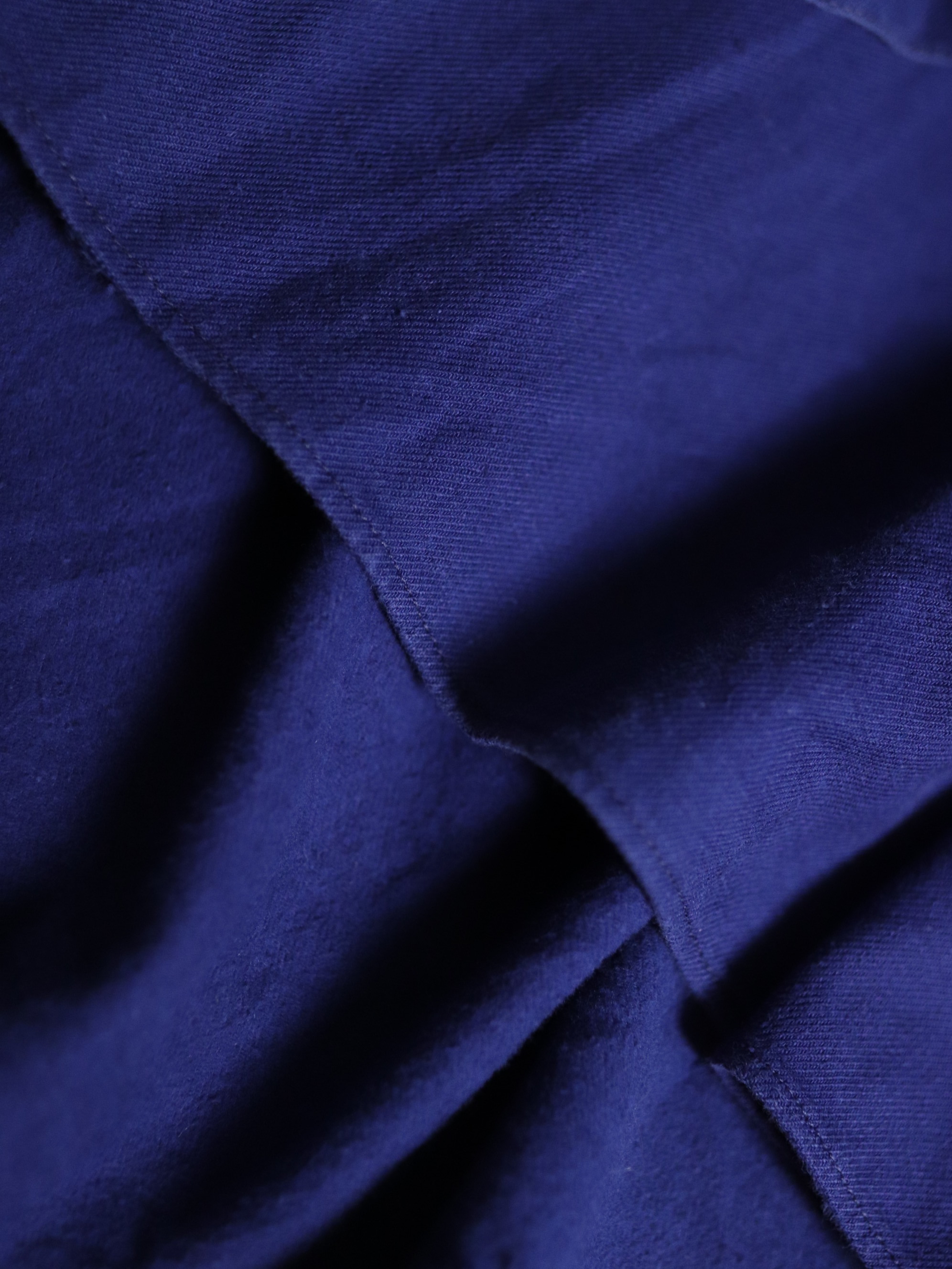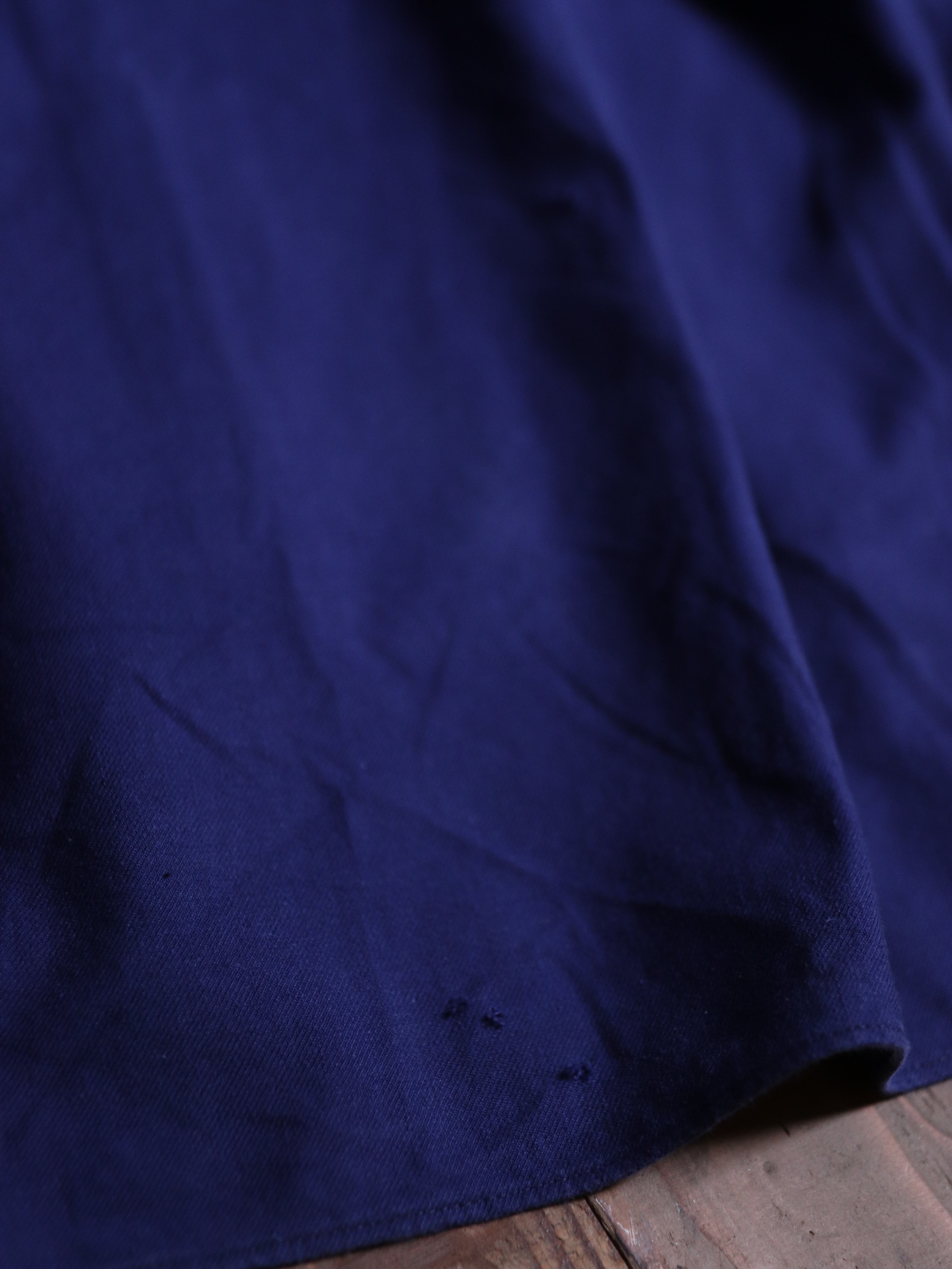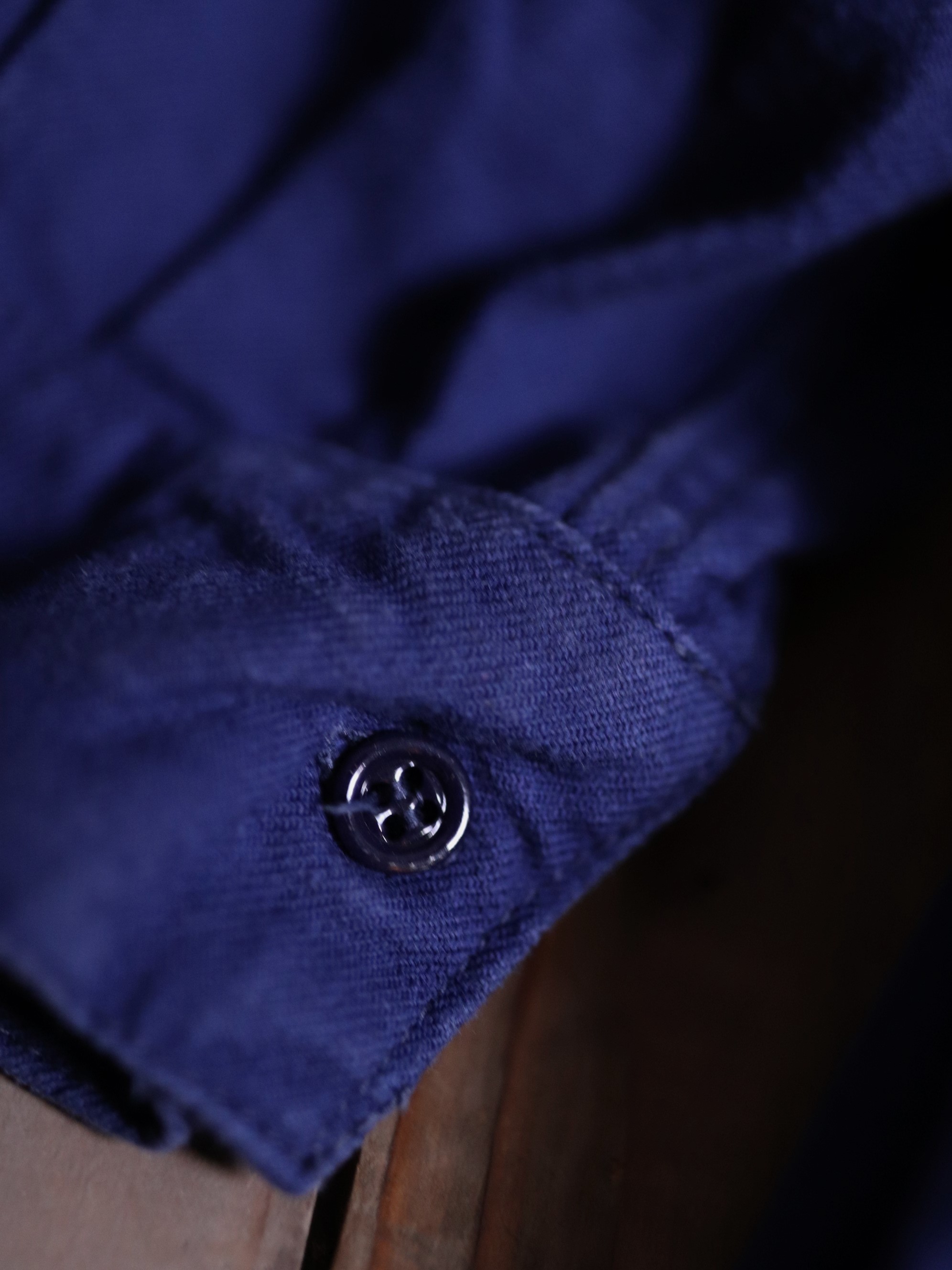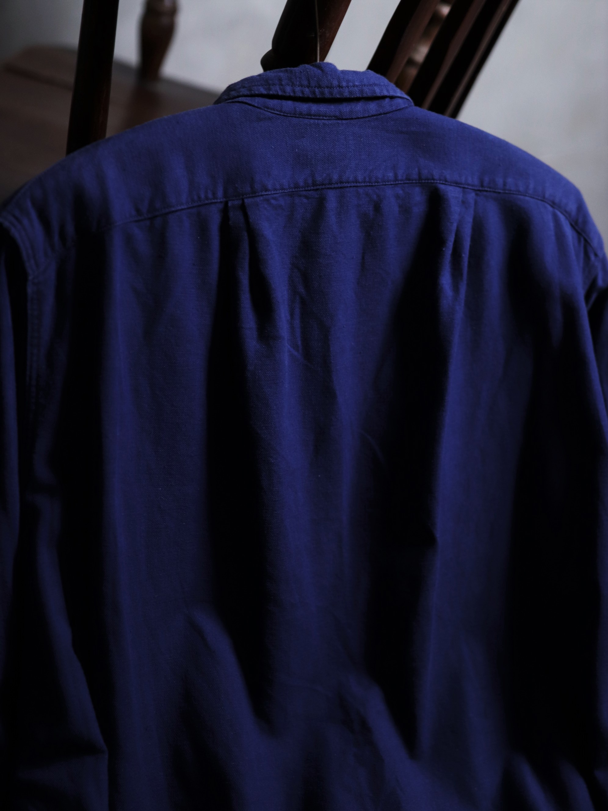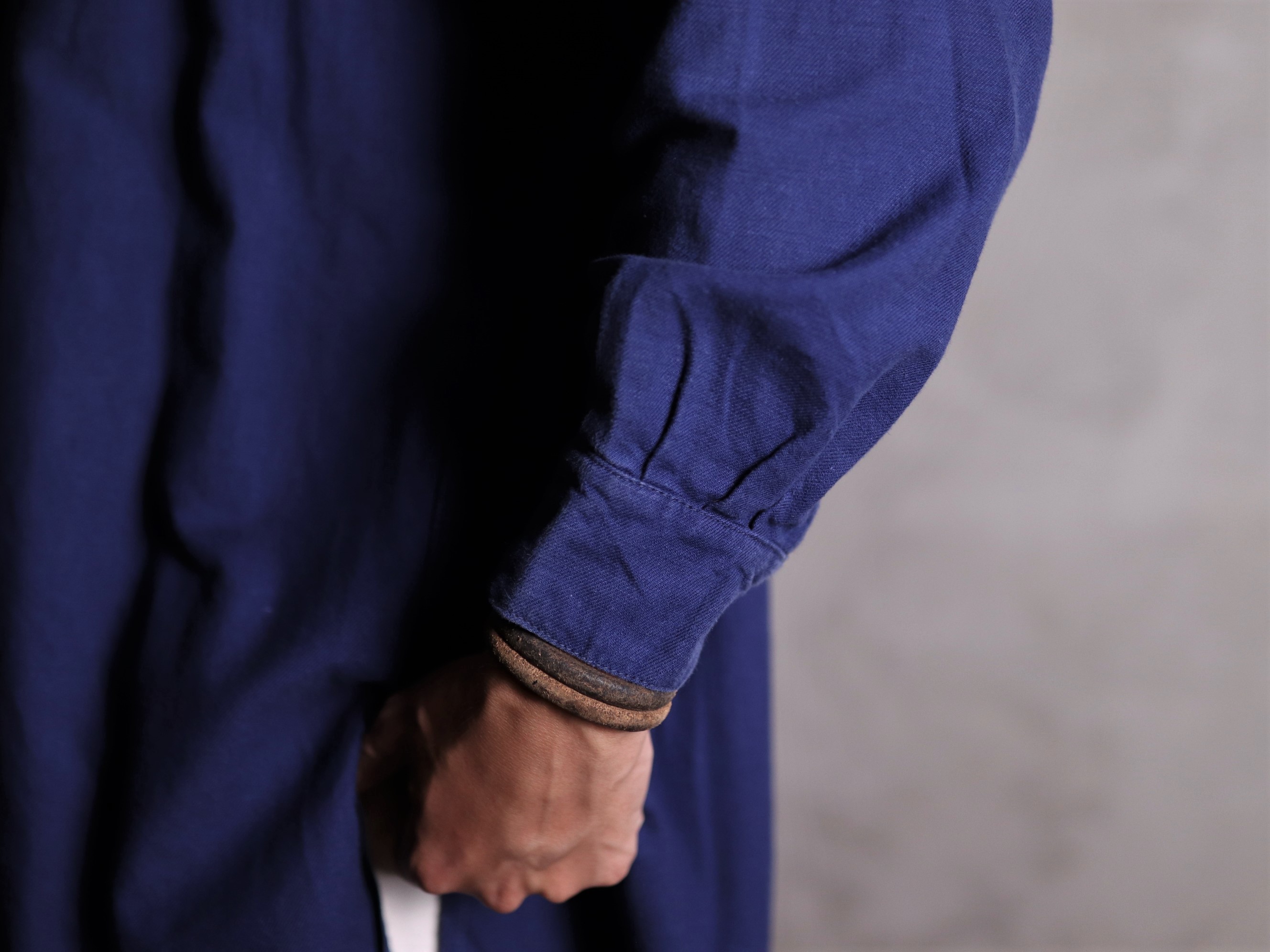 1940年代/法國早期長版藍染襯衫/Indigo藍染/胸前兩側立體口袋/前短後長/兩側開岔/袖口及背後打摺/斜紋面料/內刷絨