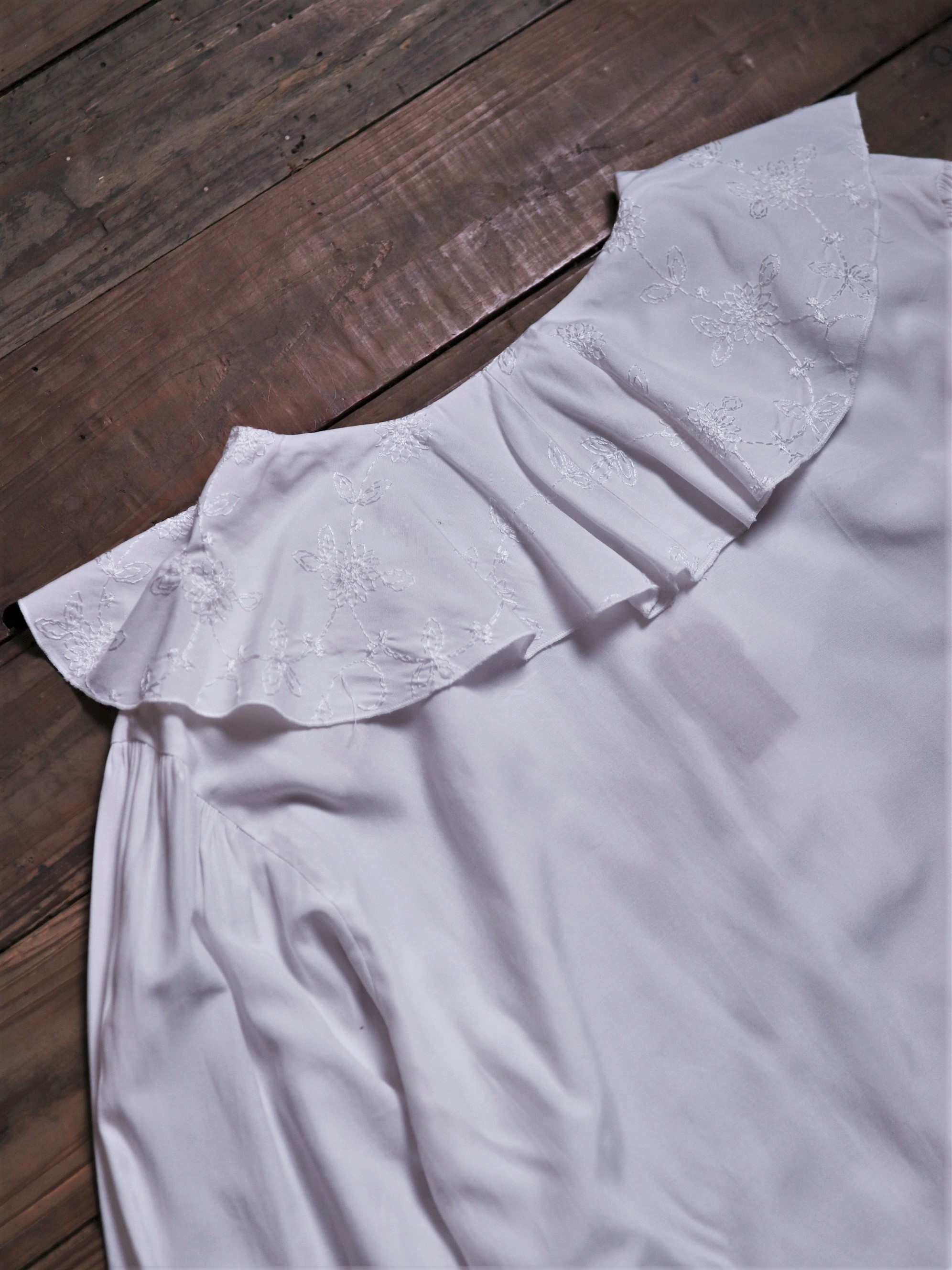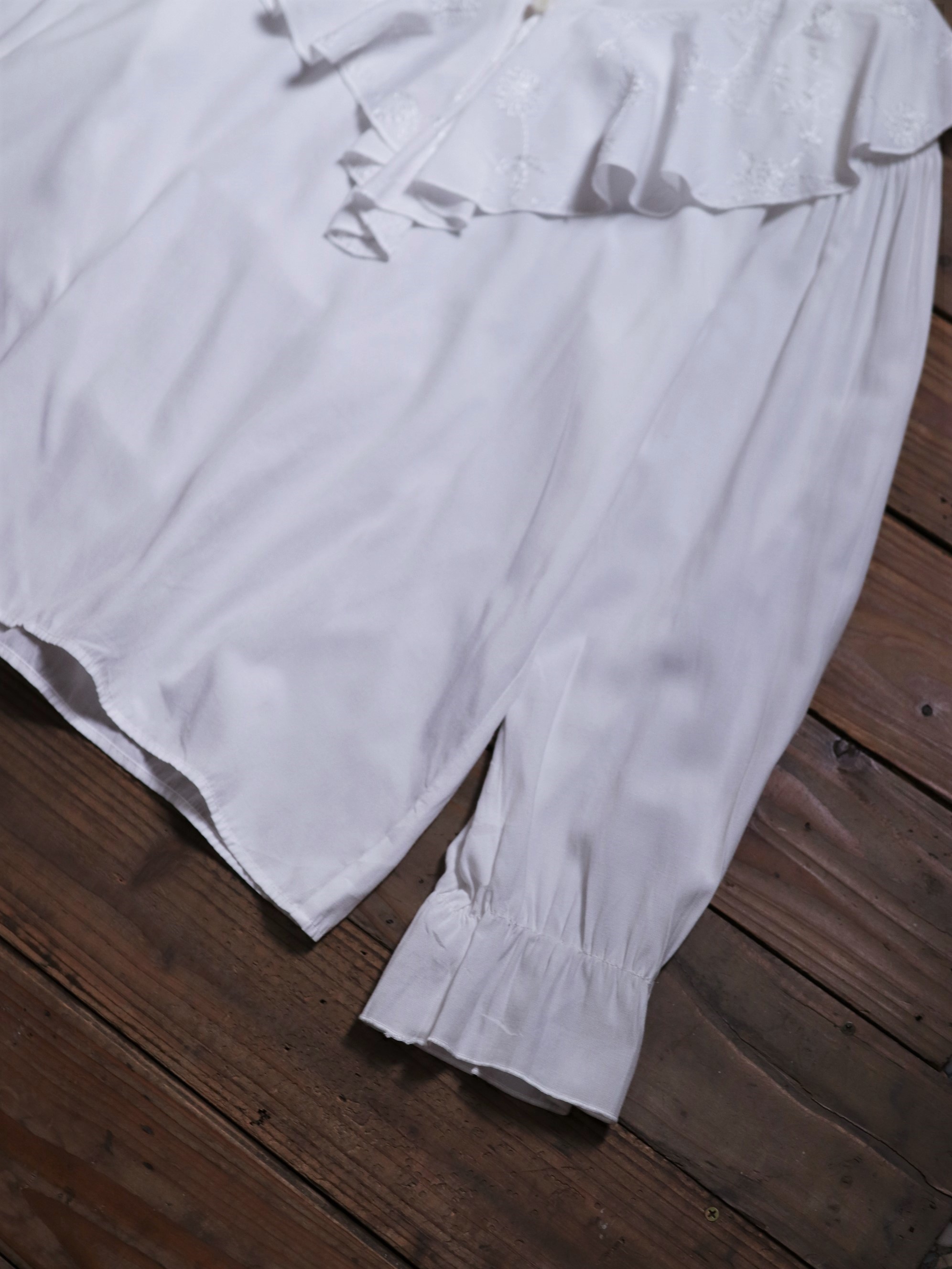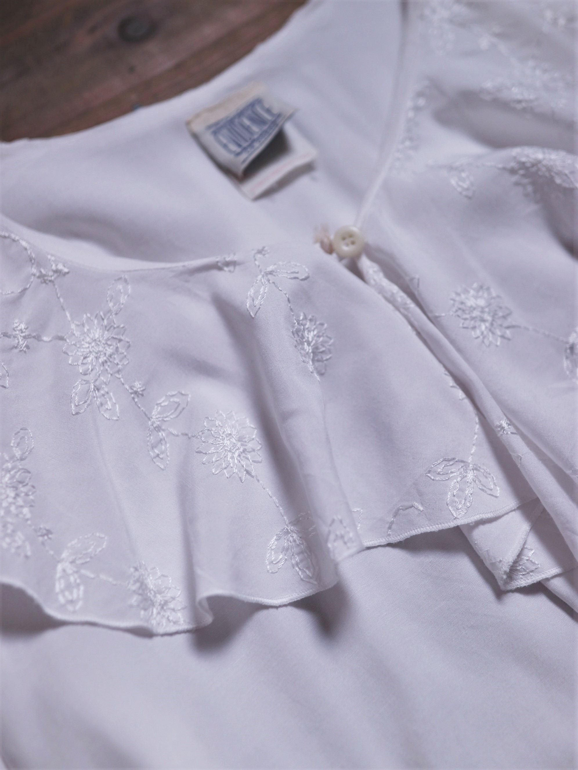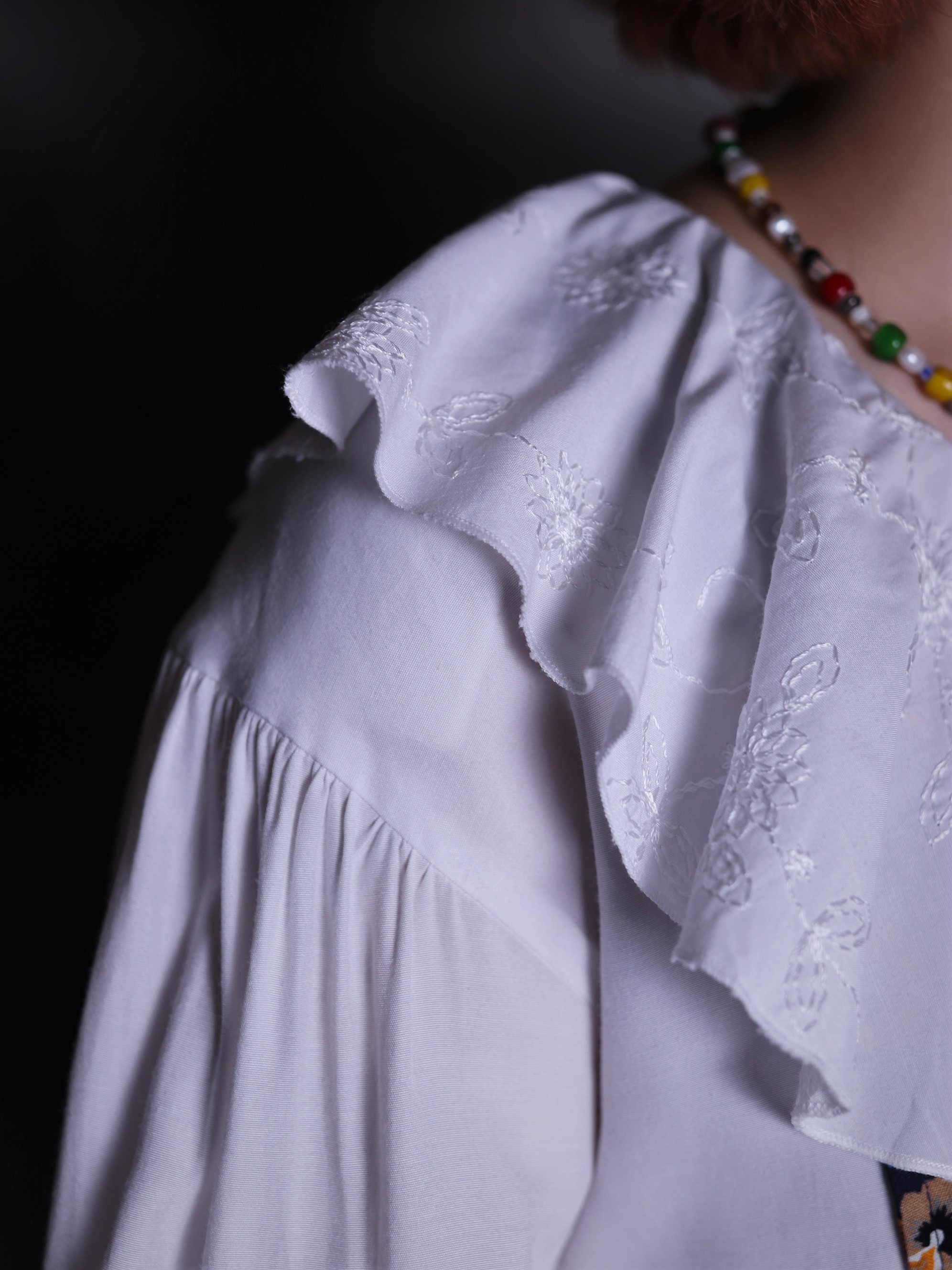 V領/大荷葉領/白色刺繡/傘狀上衣/袖口荷葉
