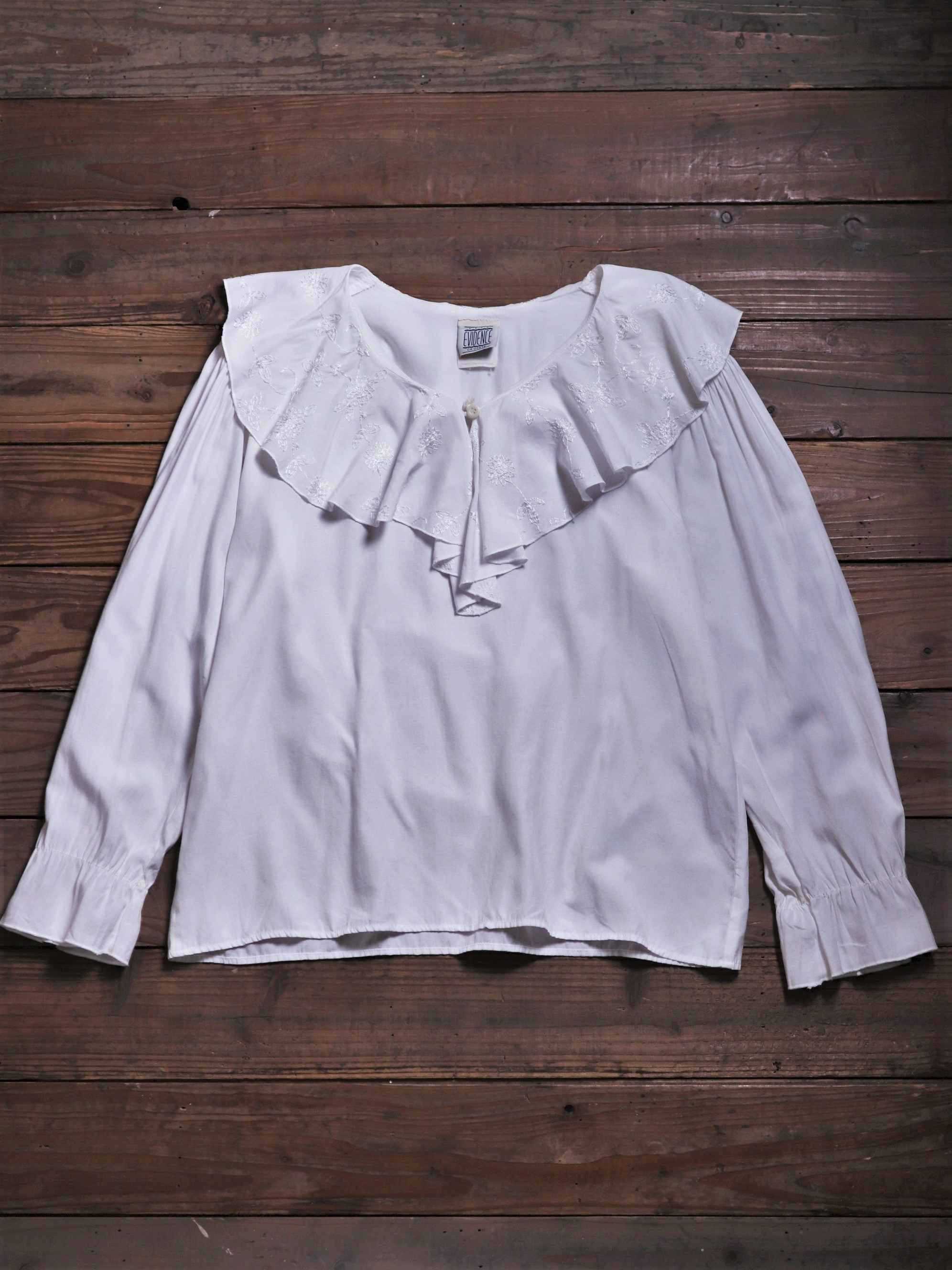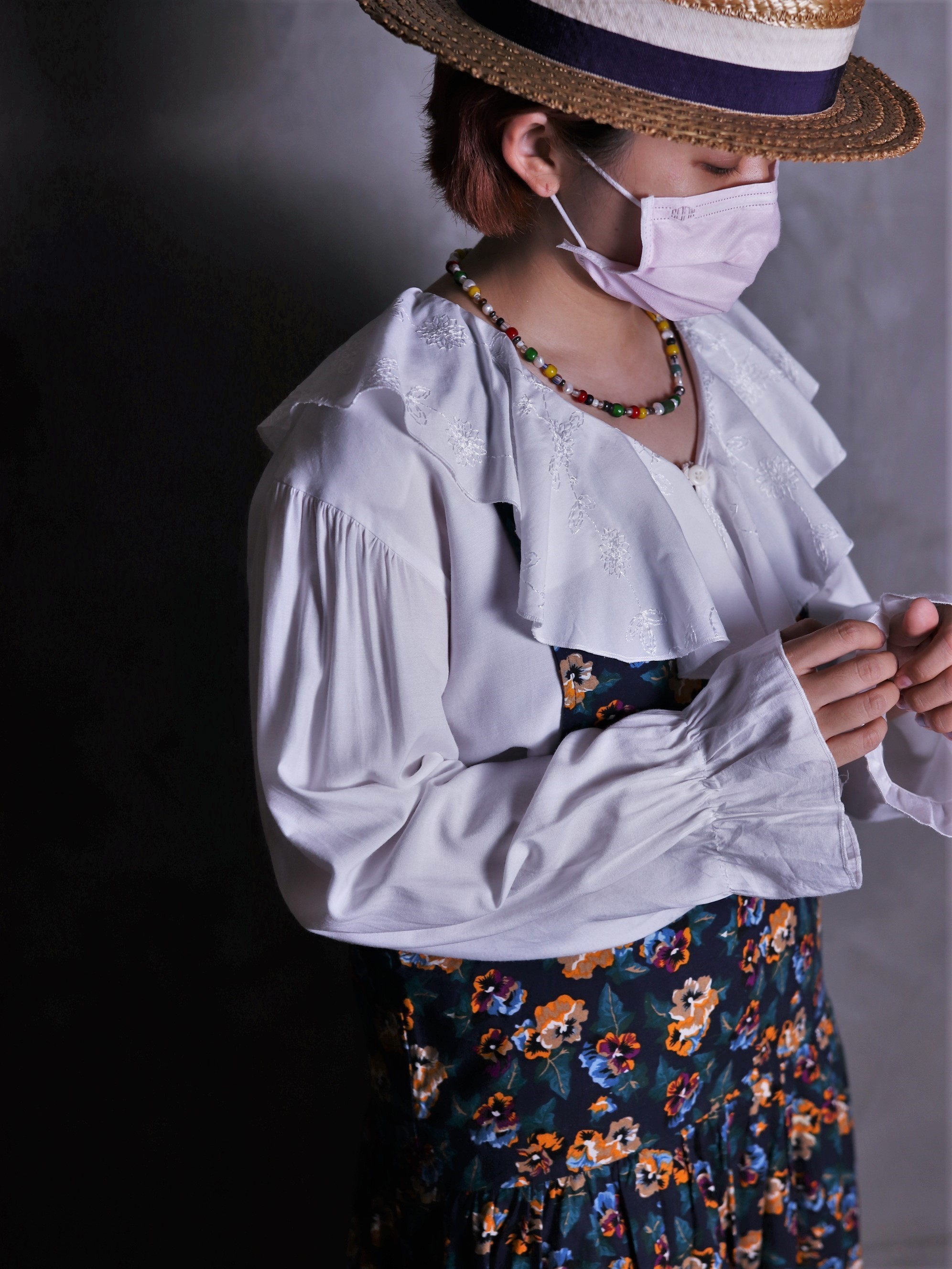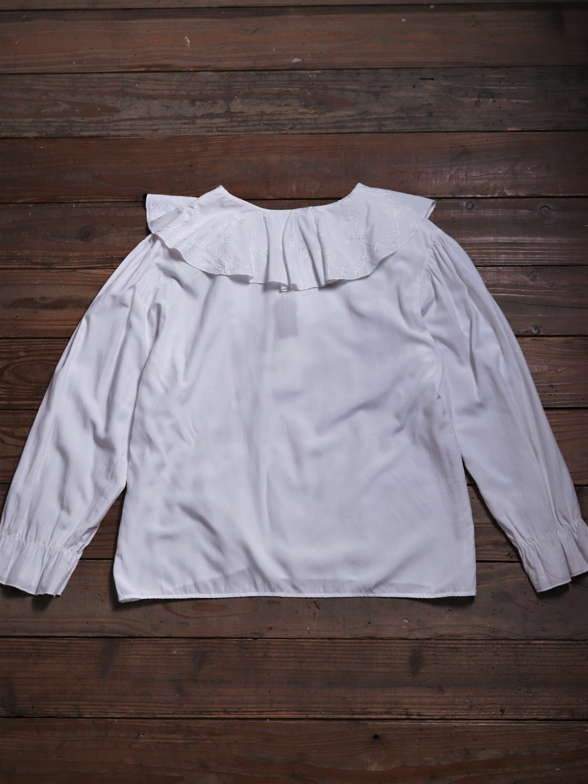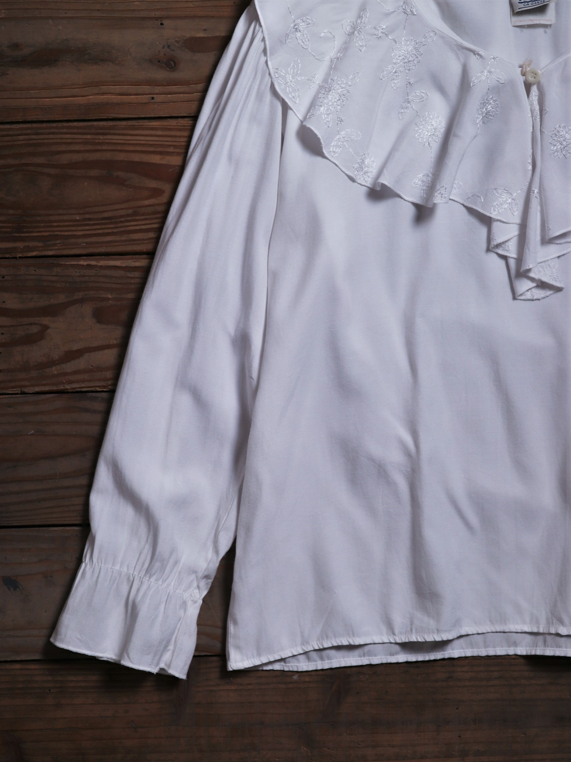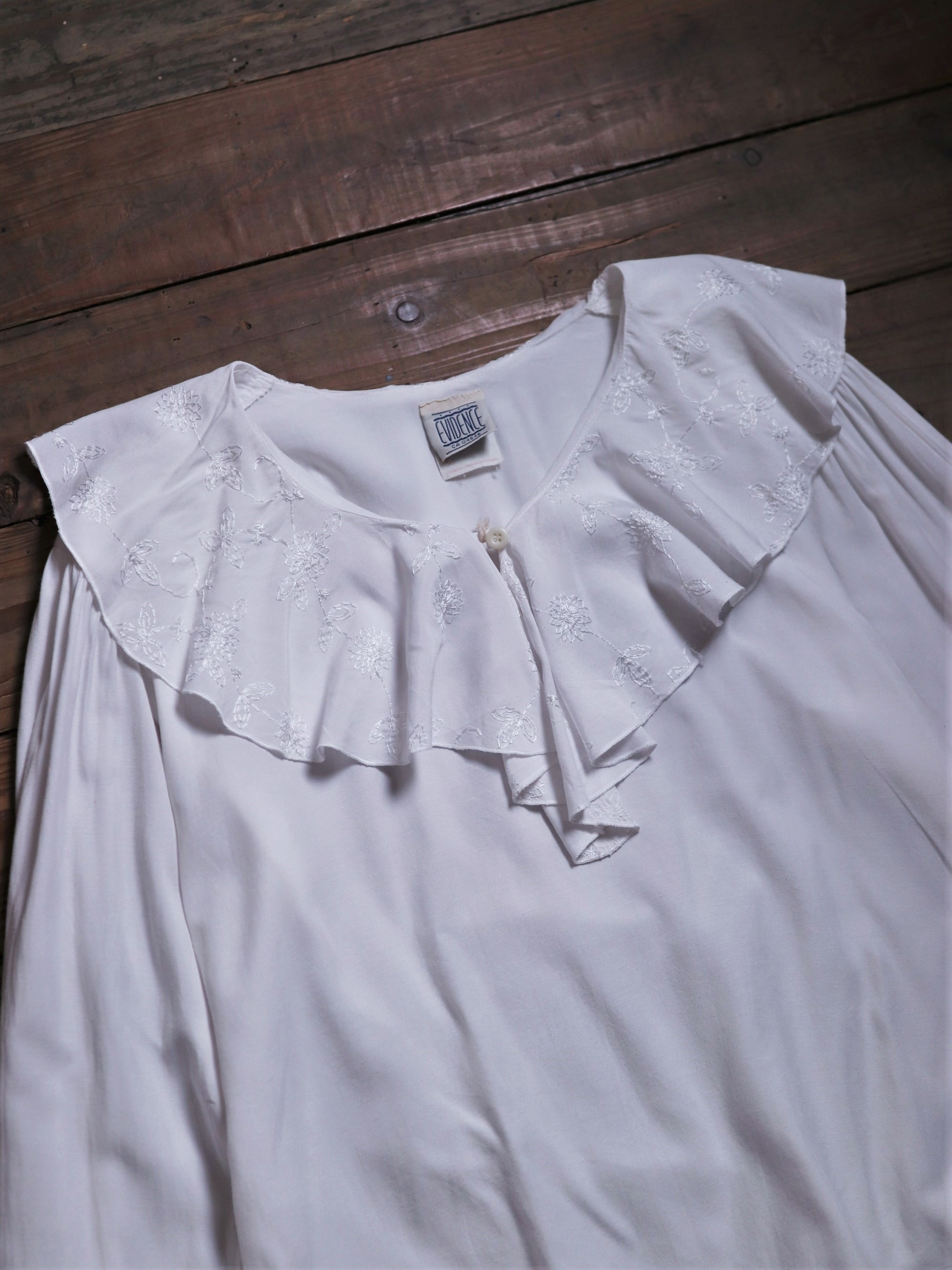 V領/大荷葉領/白色刺繡/傘狀上衣/袖口荷葉