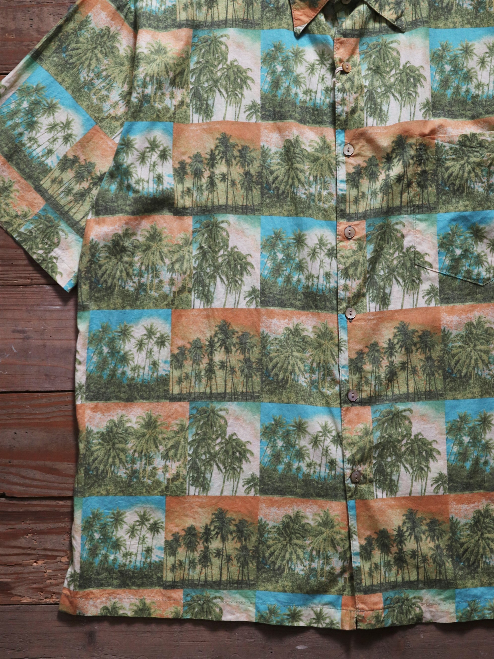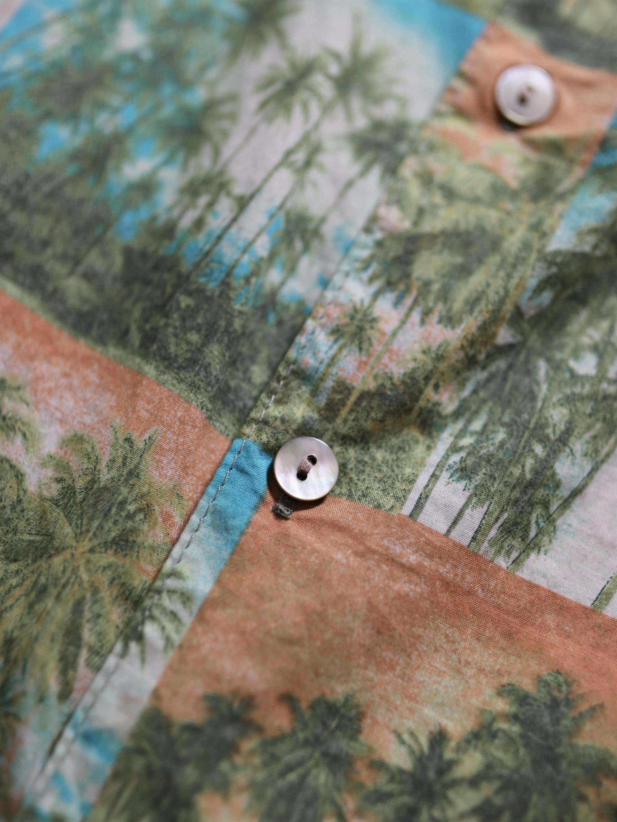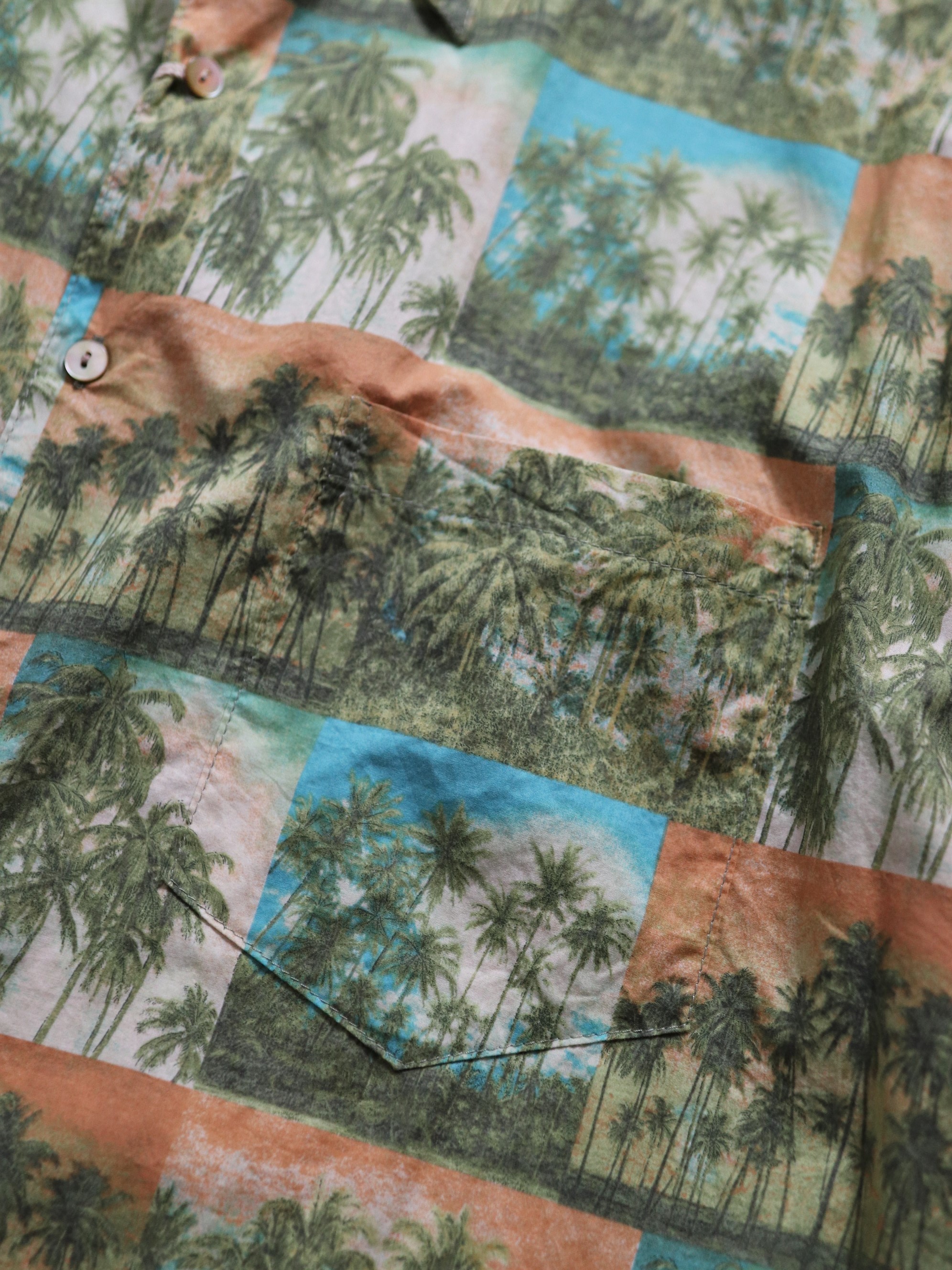 椰子樹拼格夏威夷印花/口袋對花/透氣涼爽/兩側下擺開岔