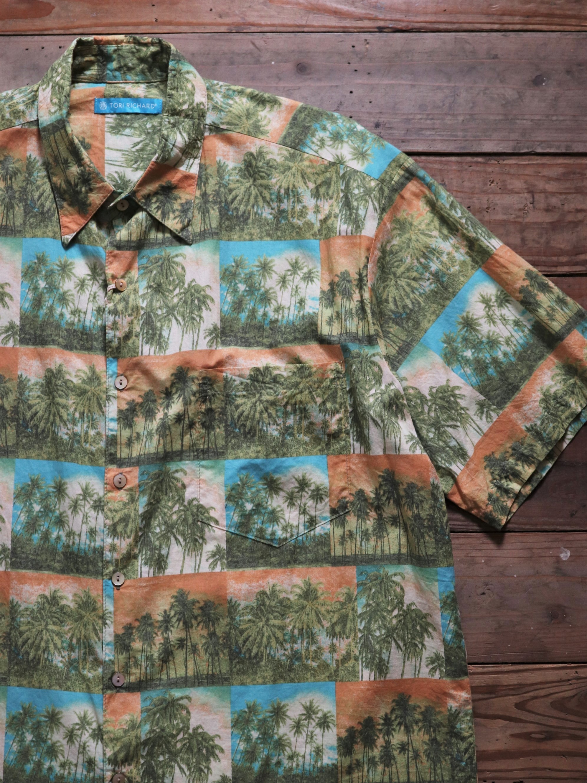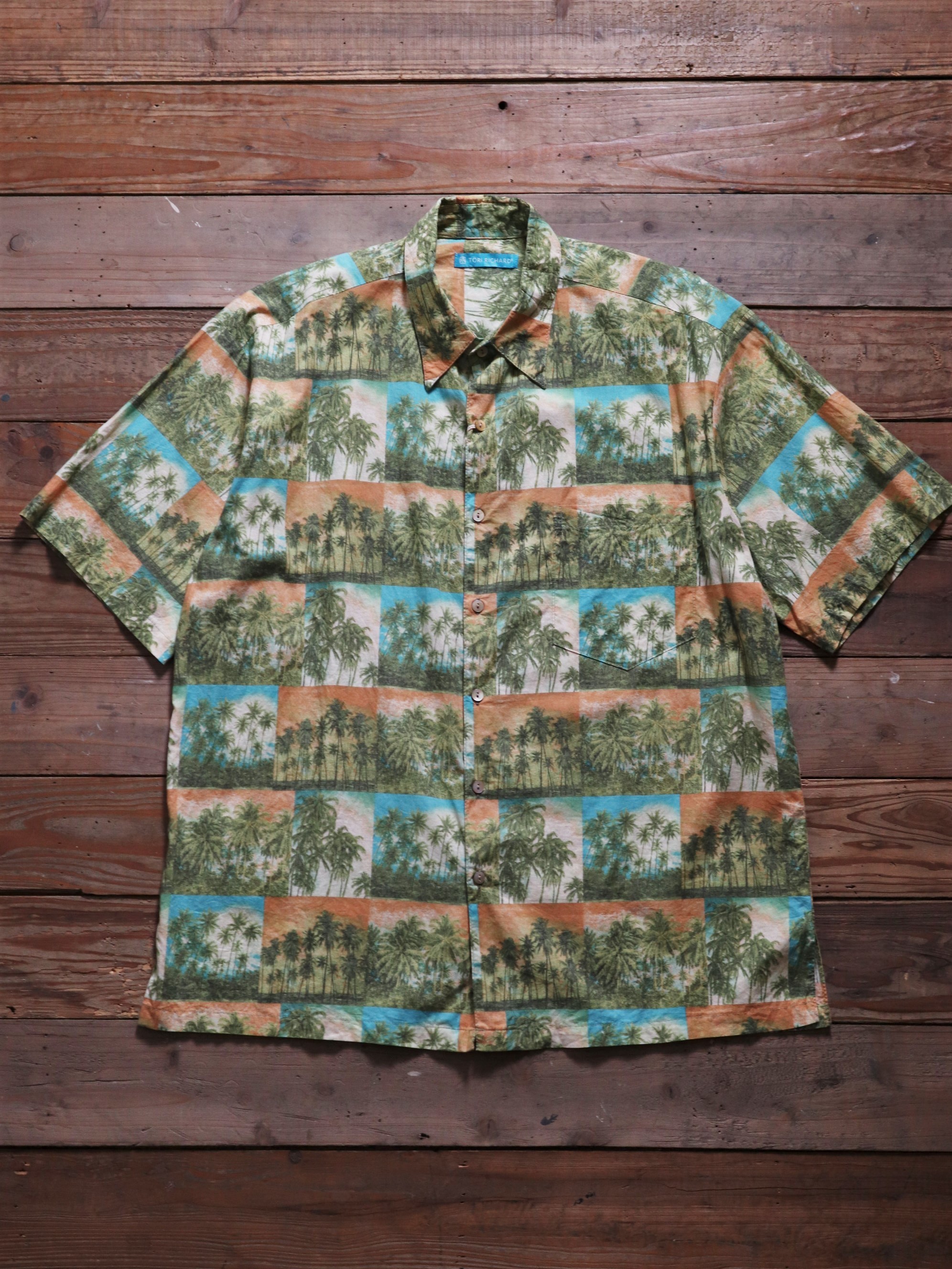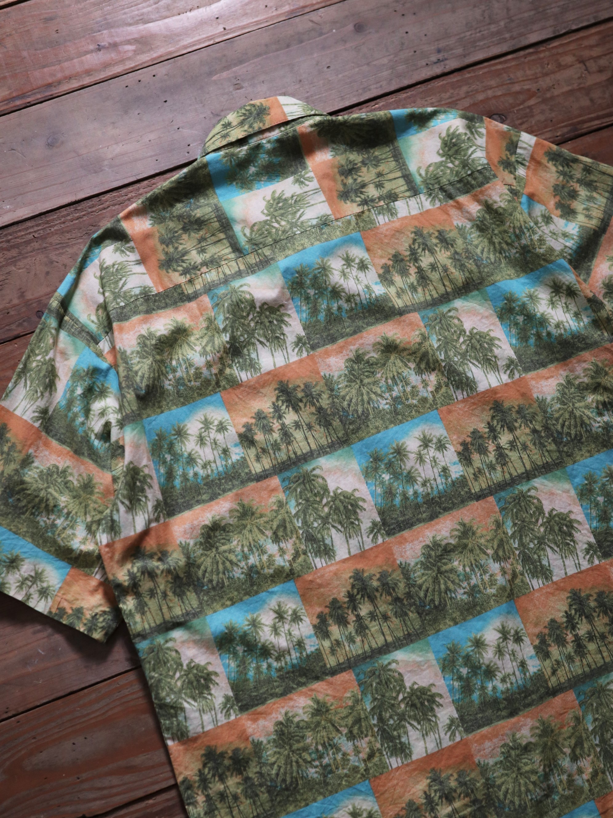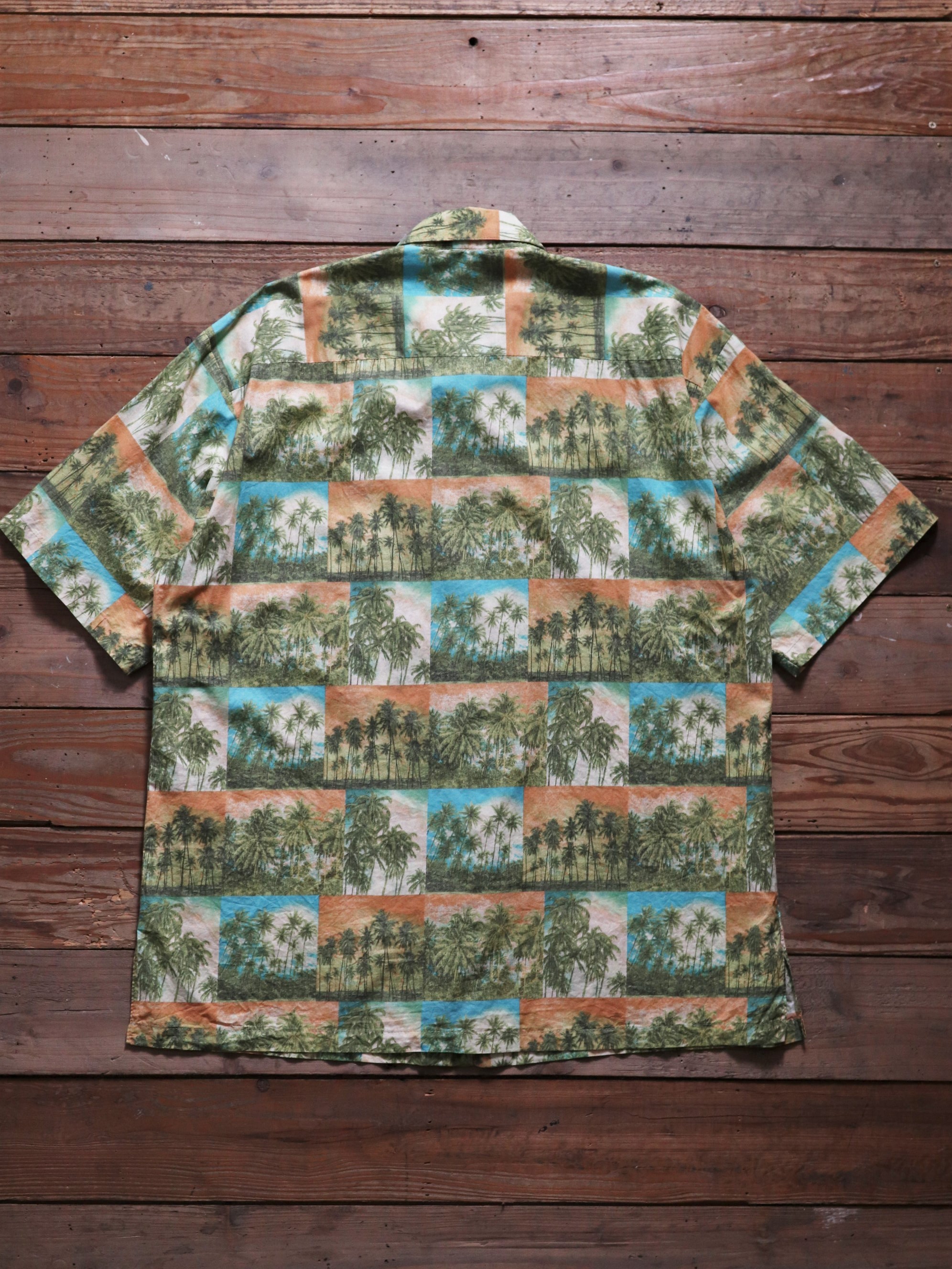 椰子樹拼格夏威夷印花/口袋對花/透氣涼爽/兩側下擺開岔