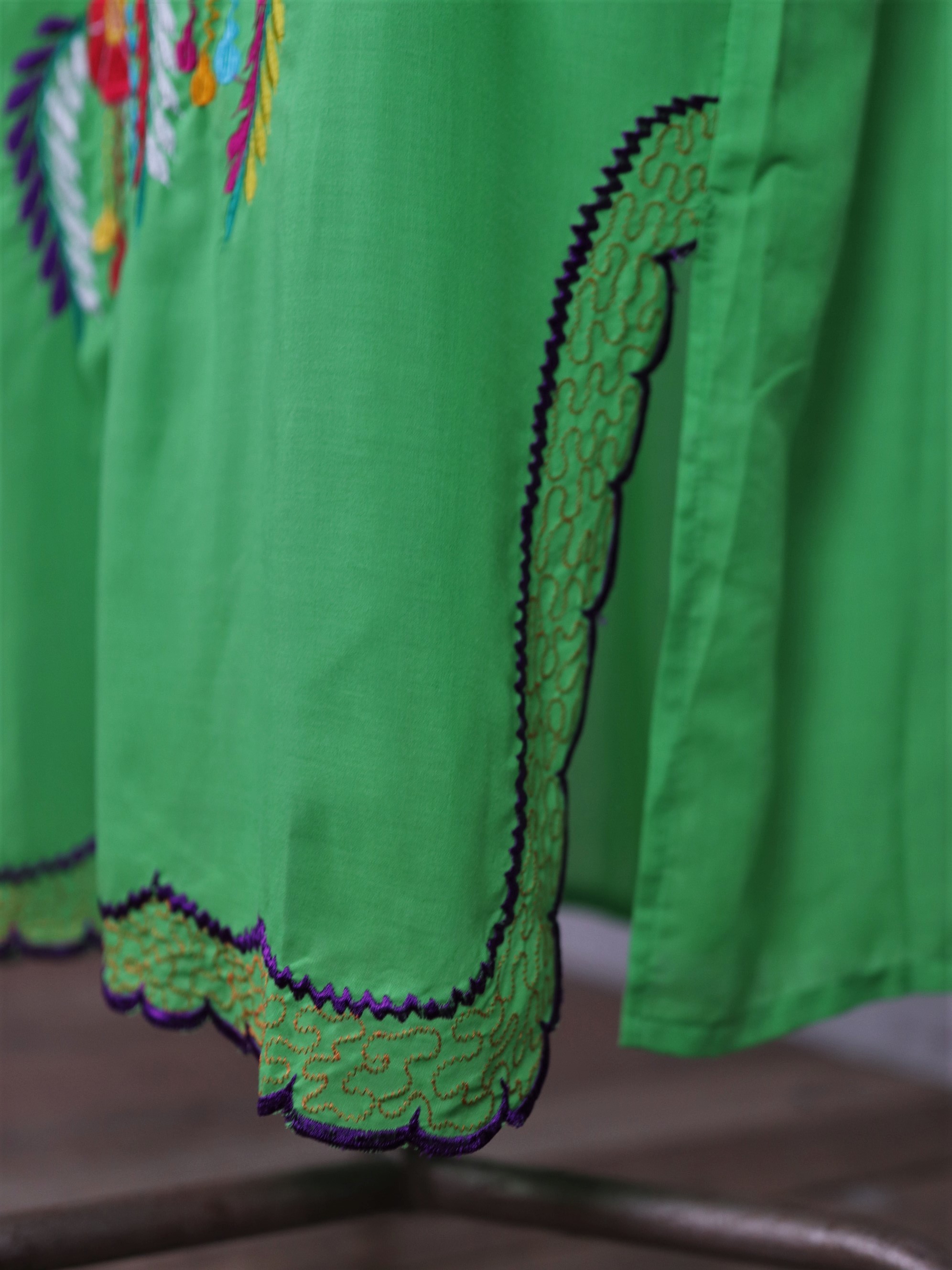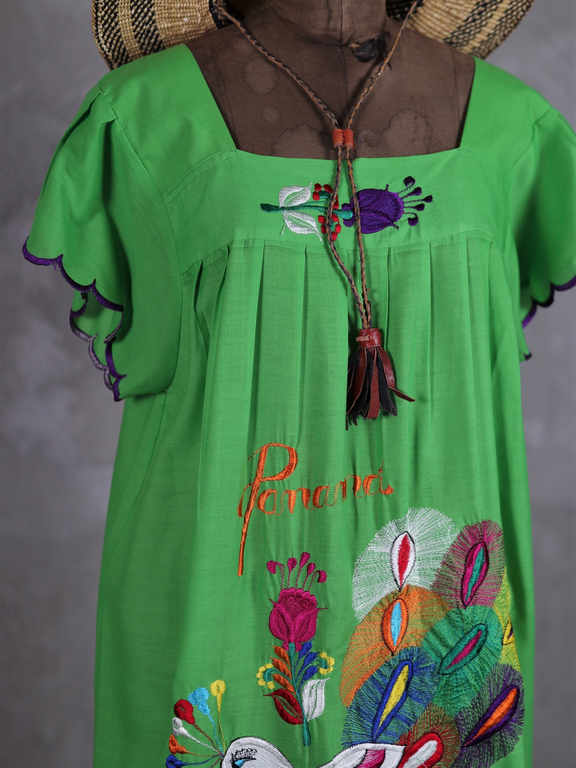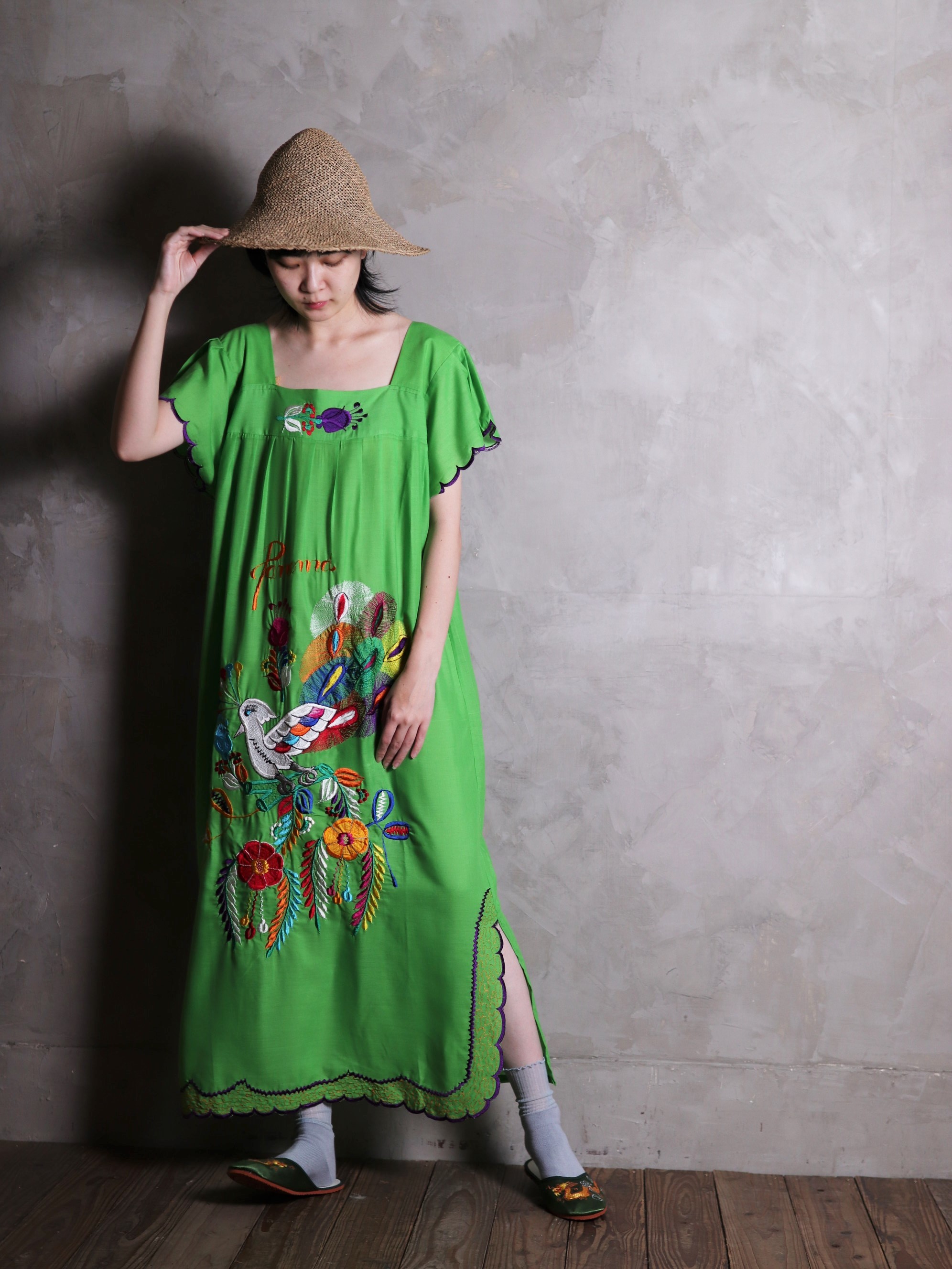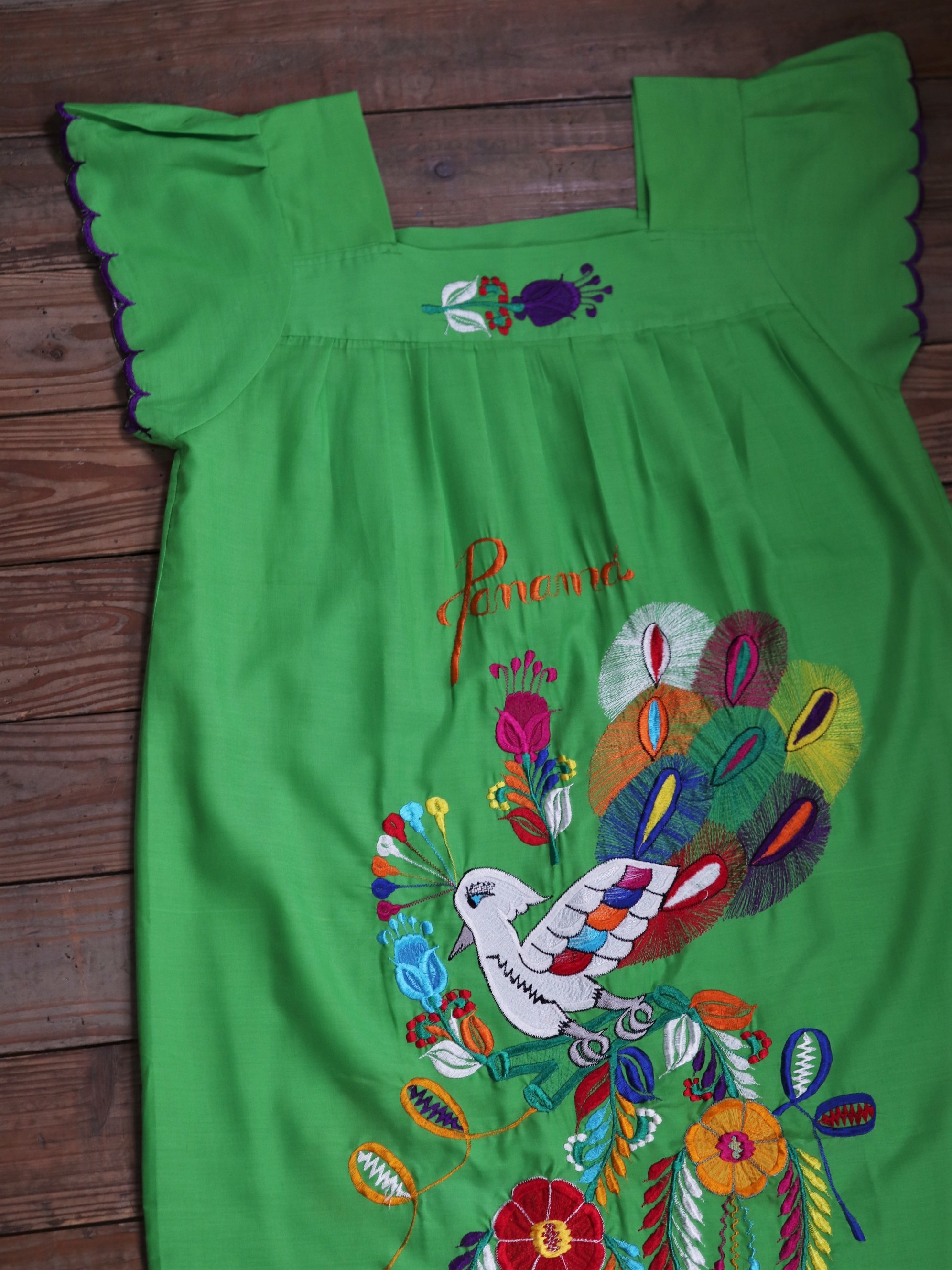 Central America Patchwork Embroidered Dress / 中美洲 巴拿馬 孔雀拼布刺繡 螢光綠 荷葉袖洋裝