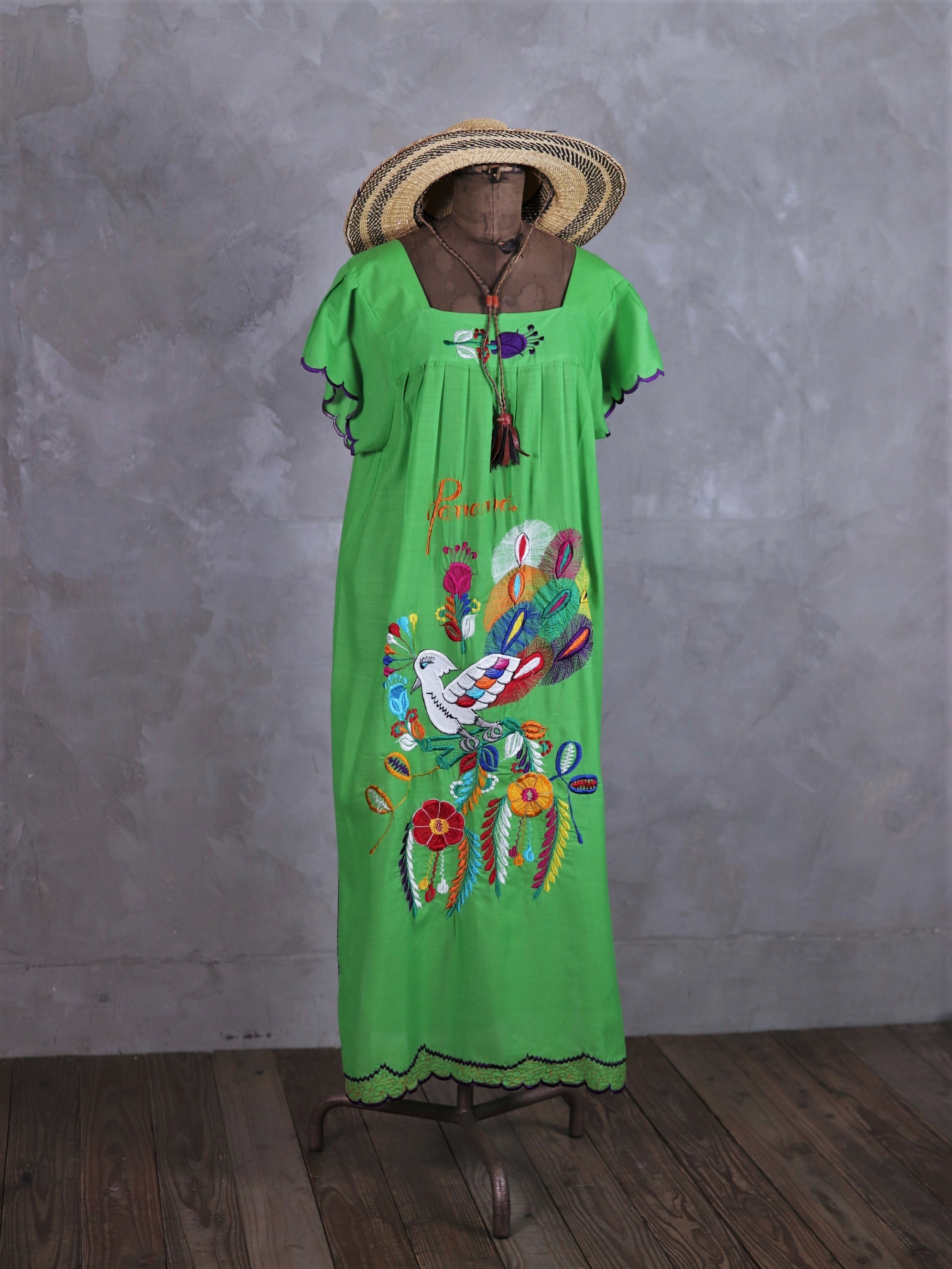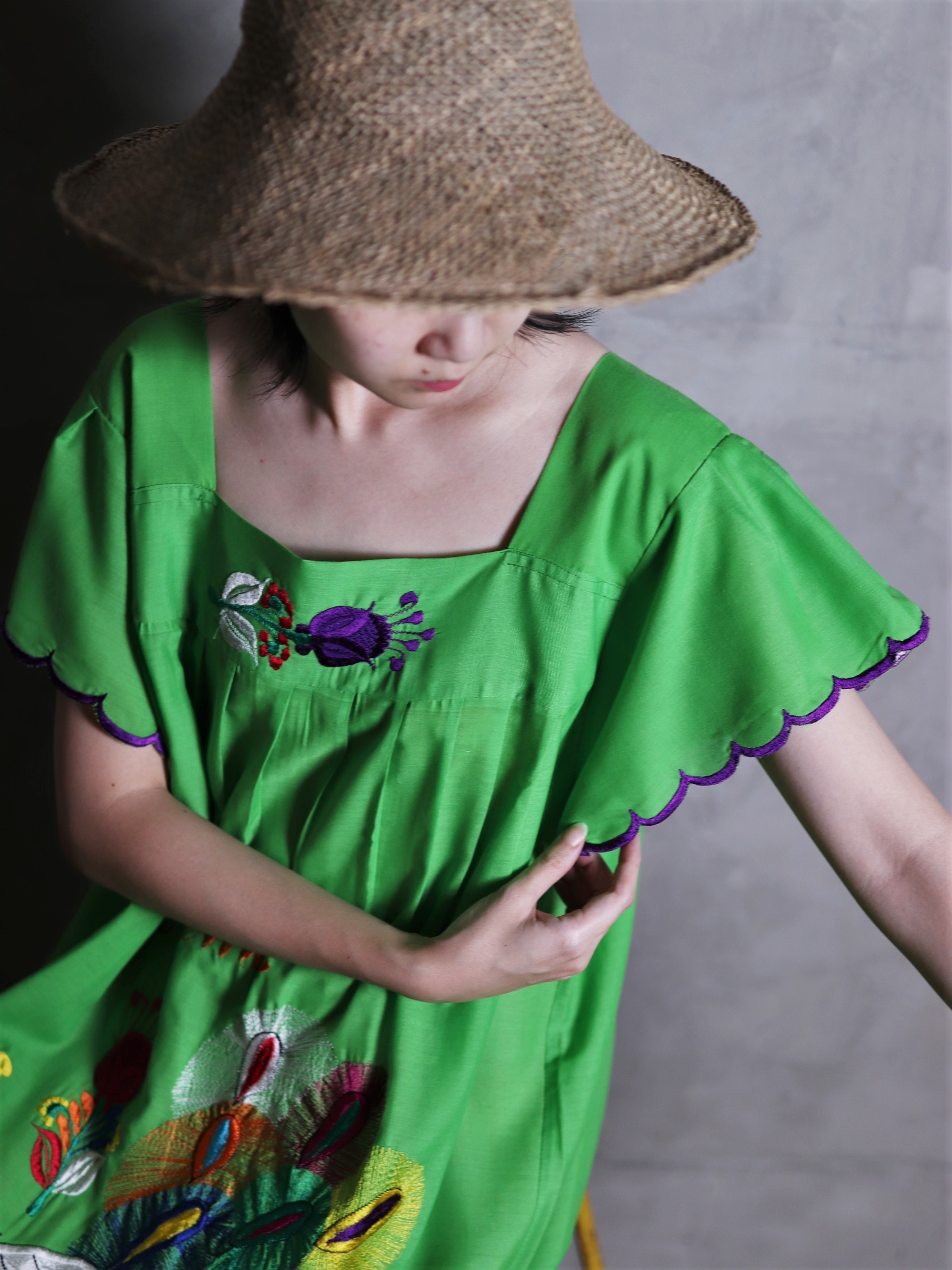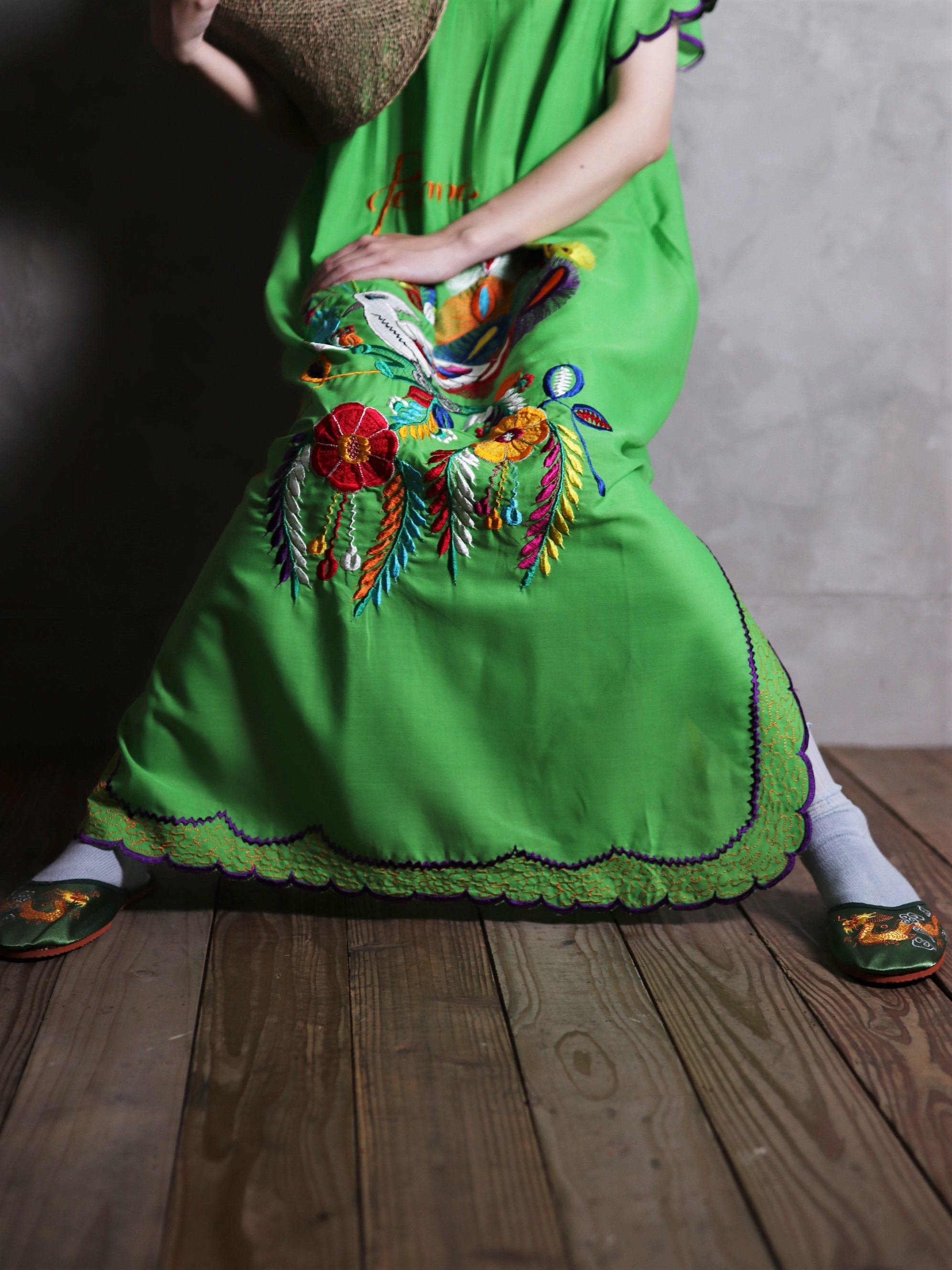 Central America Patchwork Embroidered Dress / 中美洲 巴拿馬 孔雀拼布刺繡 螢光綠 荷葉袖洋裝