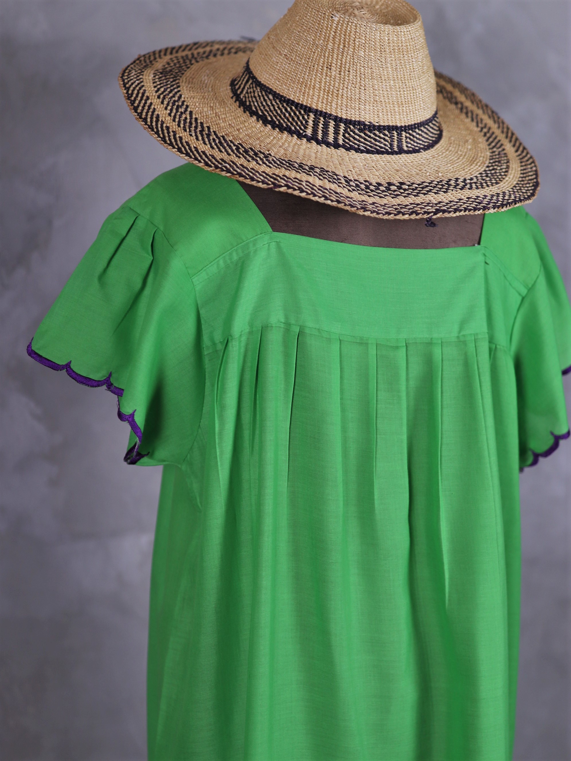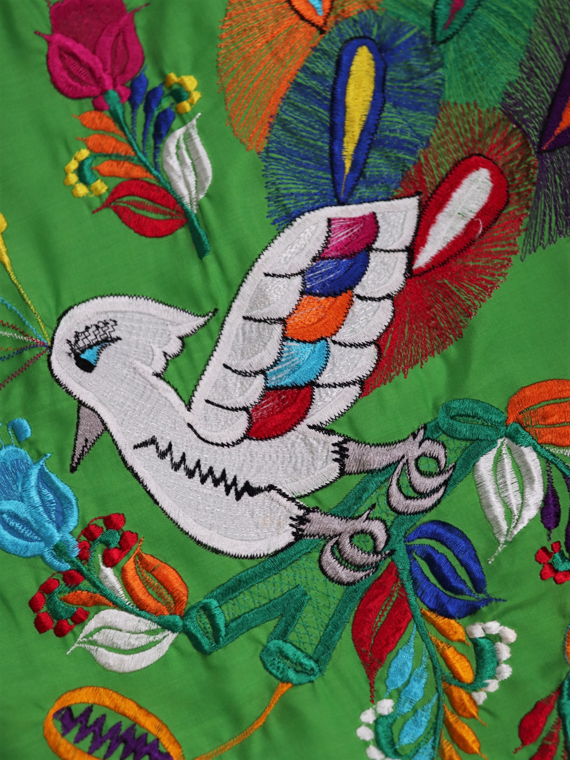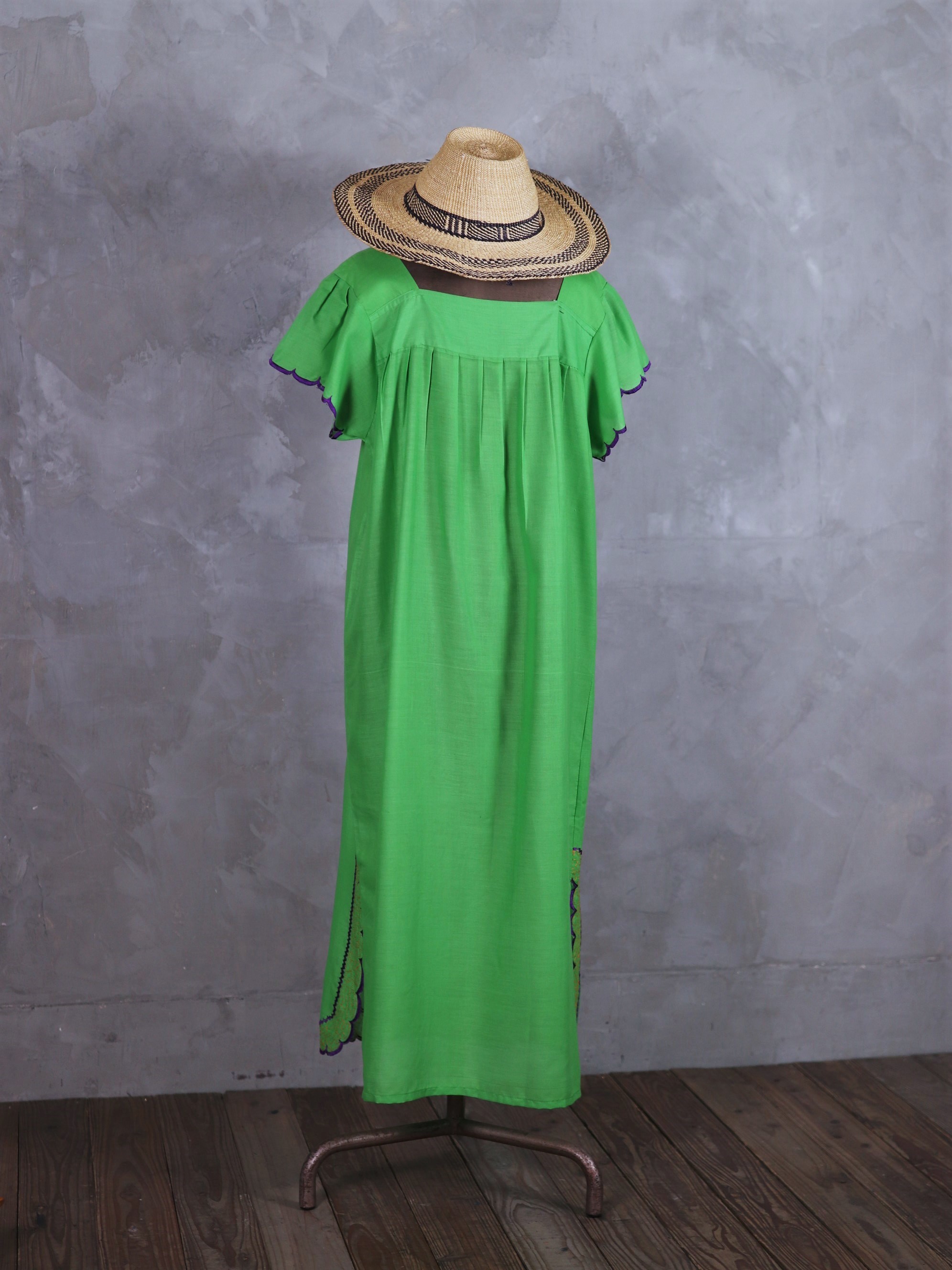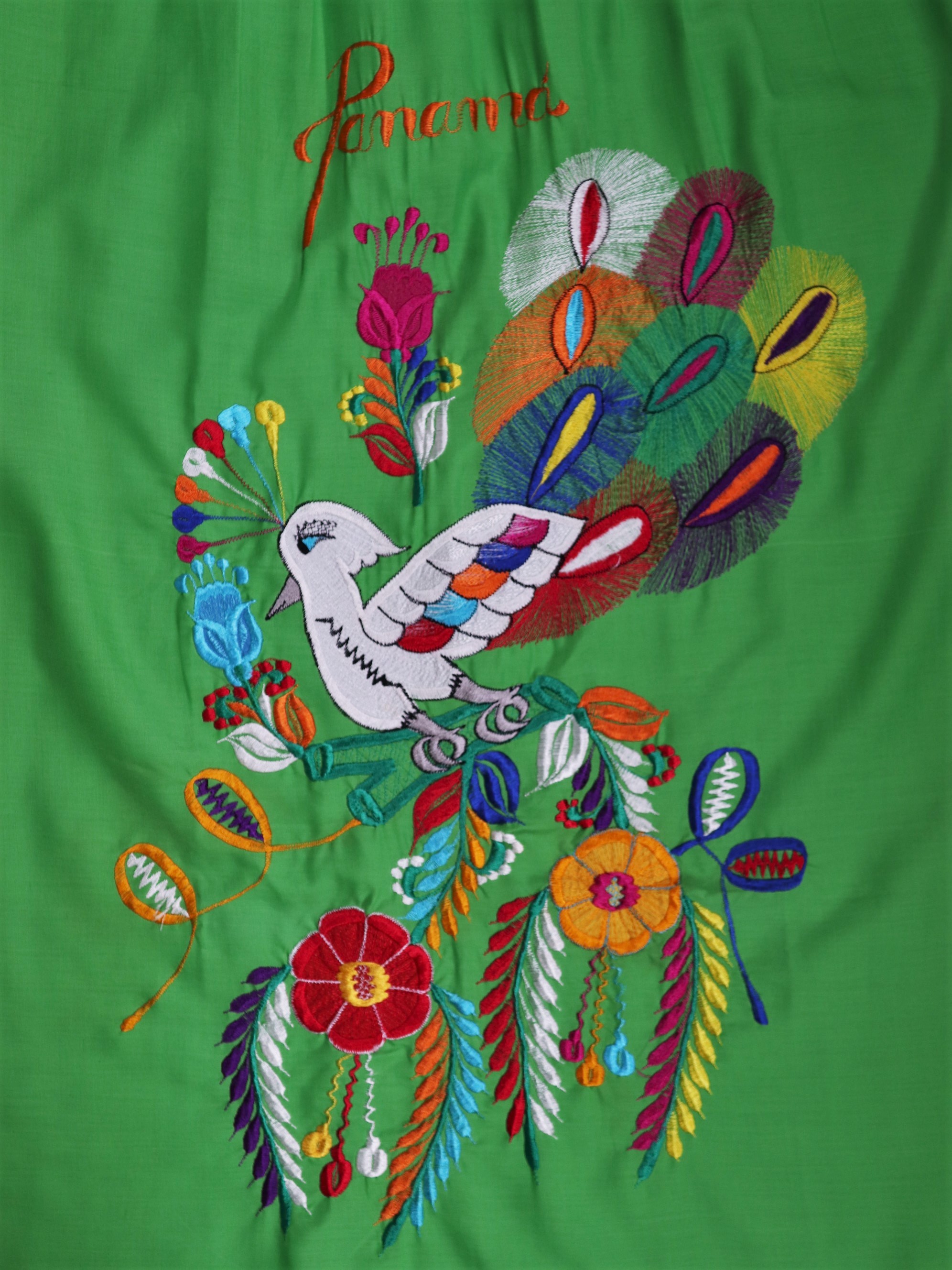 Central America Patchwork Embroidered Dress / 中美洲 巴拿馬 孔雀拼布刺繡 螢光綠 荷葉袖洋裝