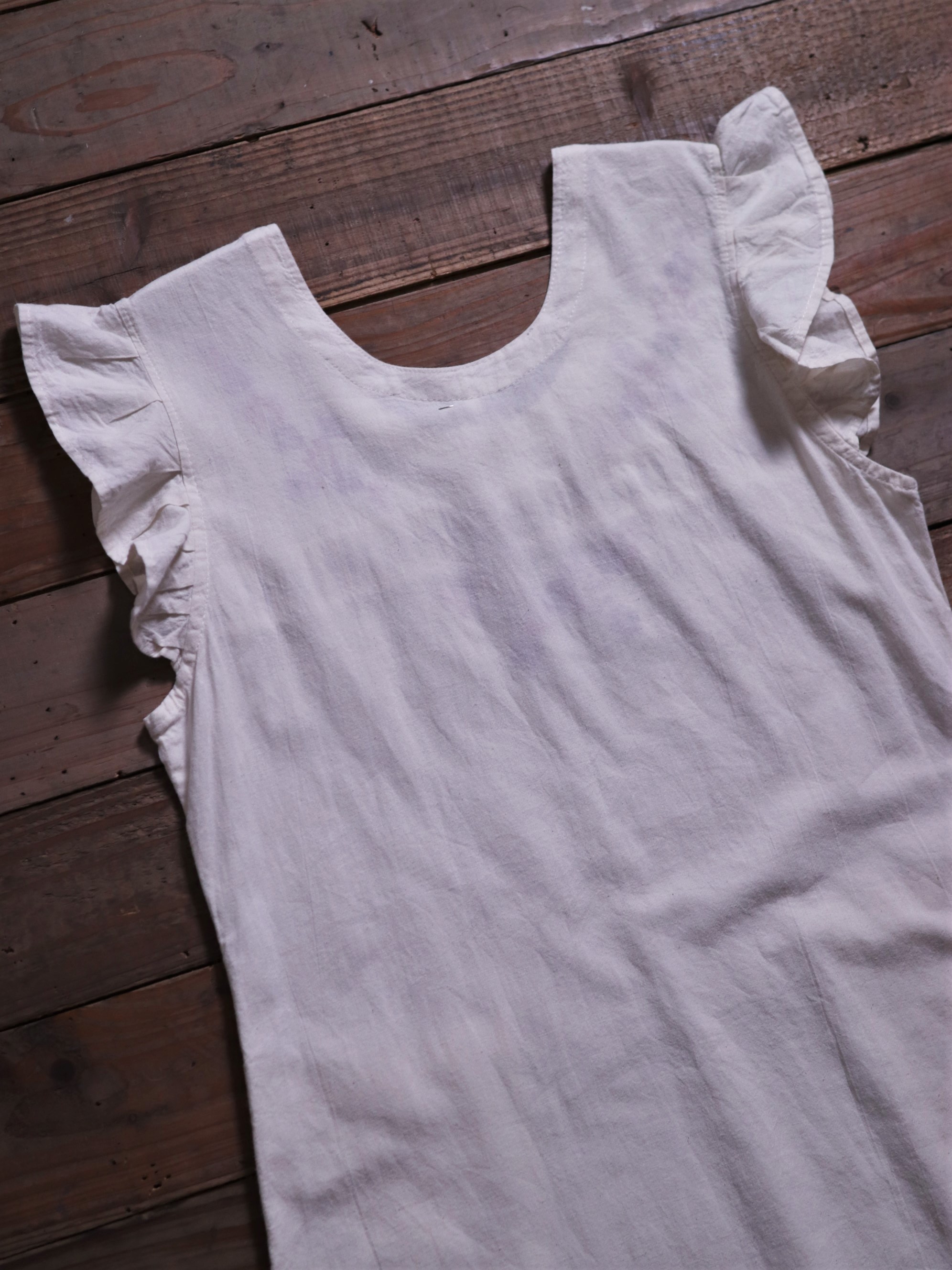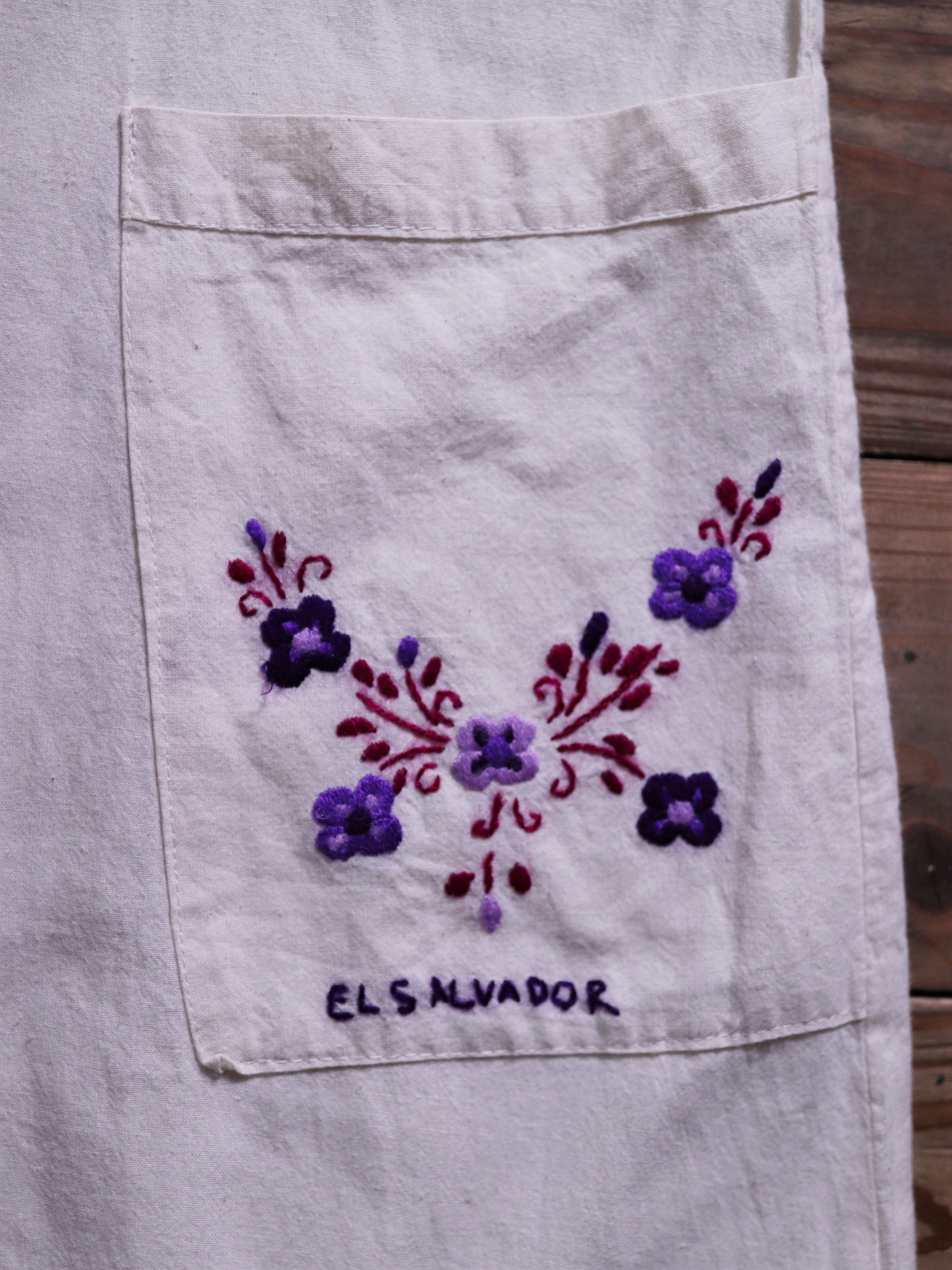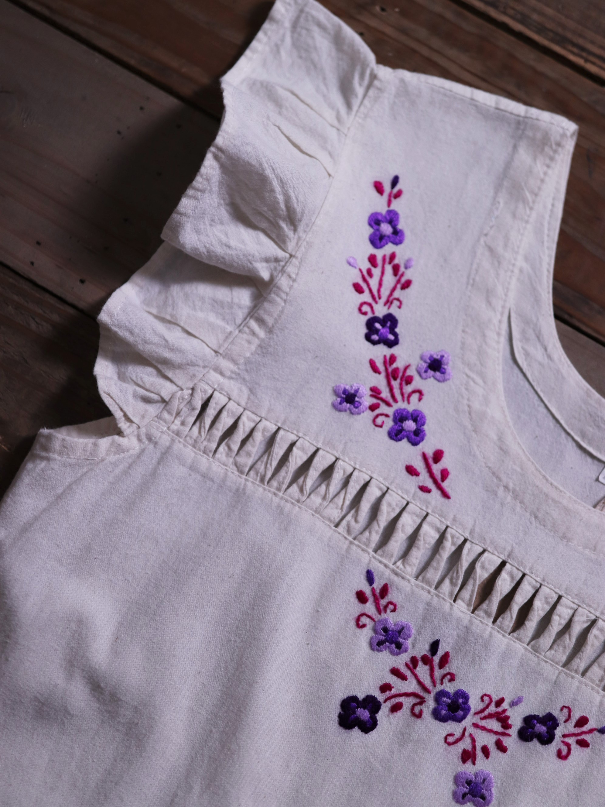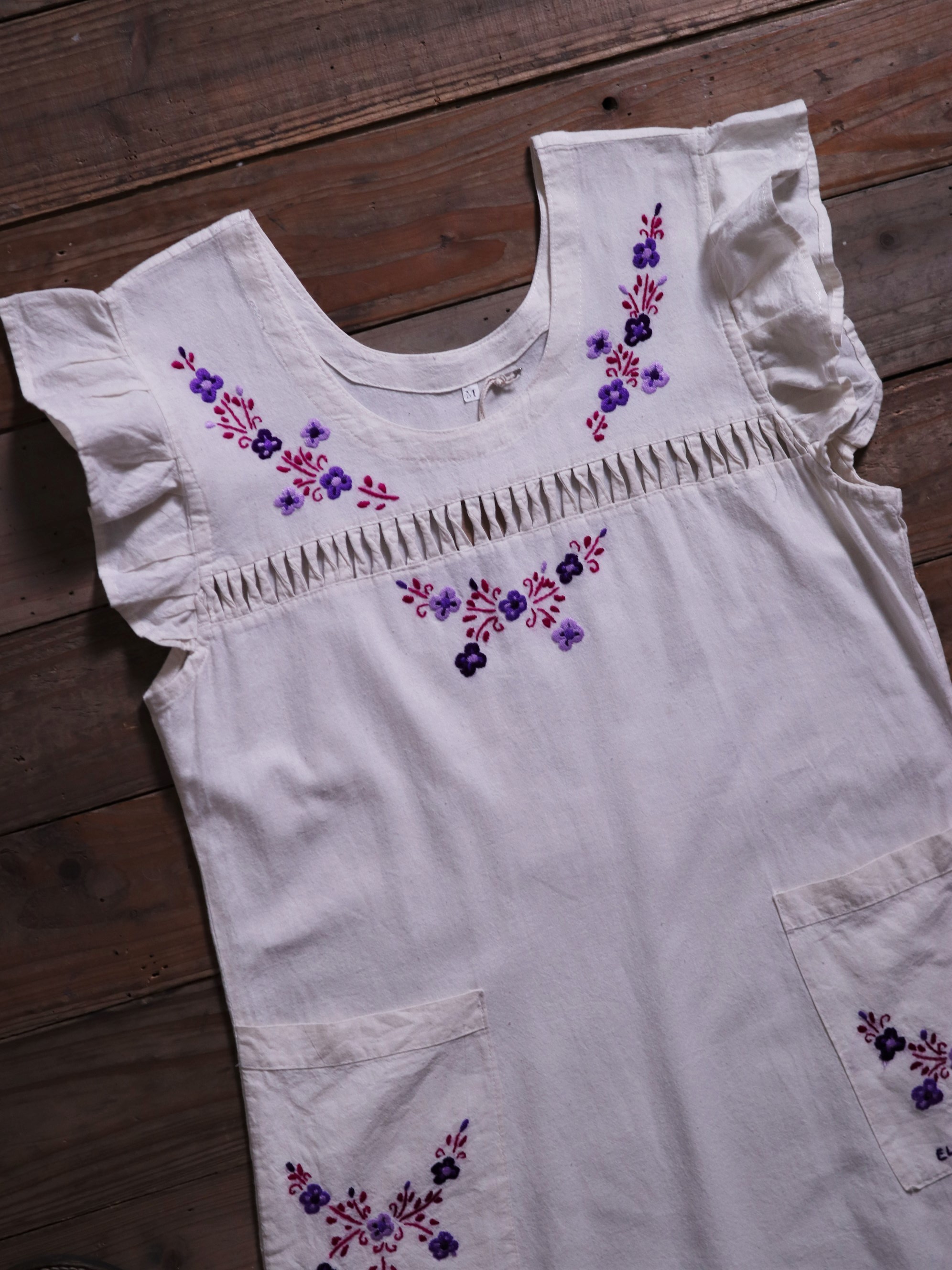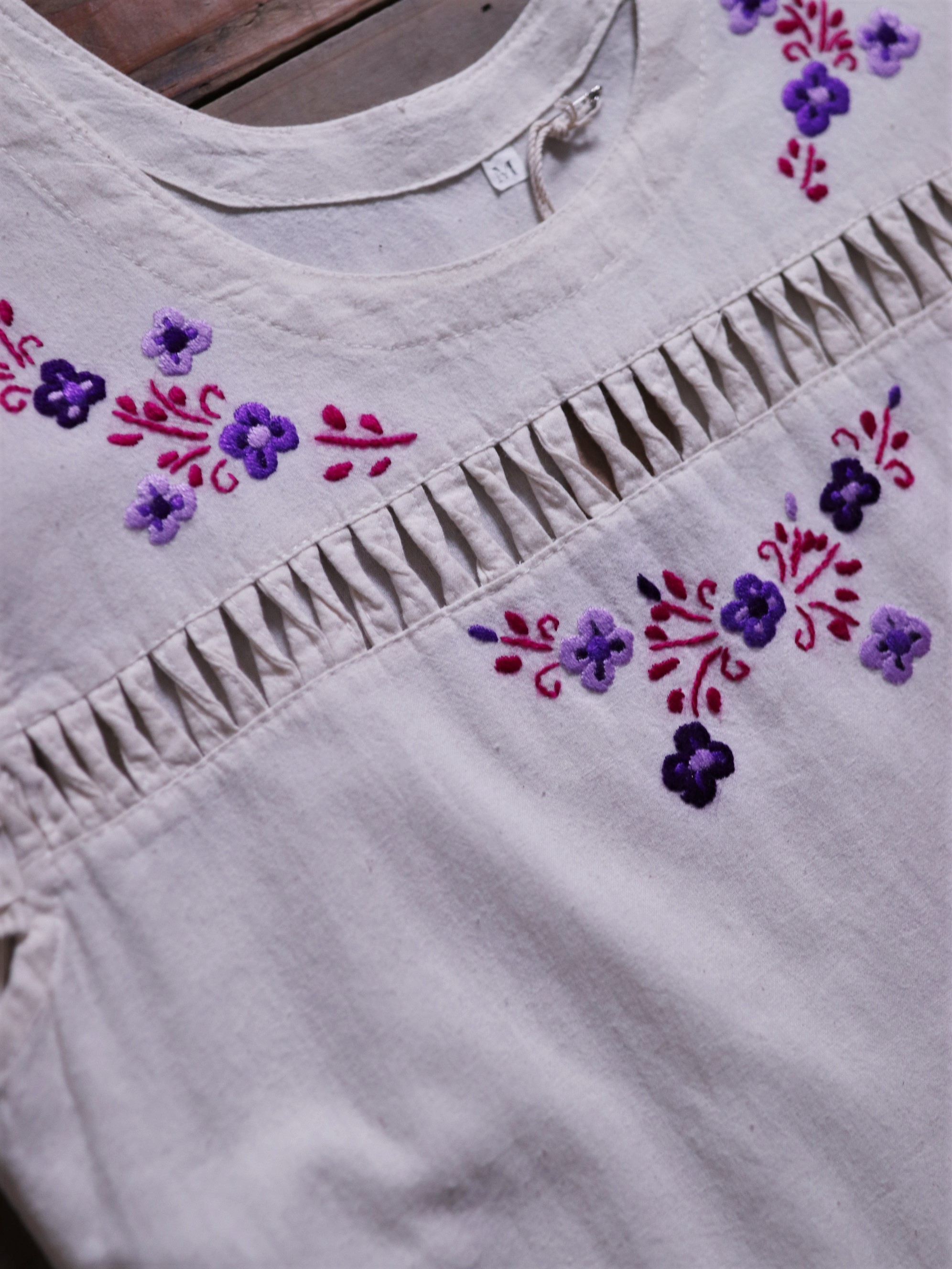 薩爾瓦多手工刺繡/紫色花卉刺繡/荷葉袖/胸前及下擺打摺簍空設計/下擺兩側口袋/兩側下擺開岔